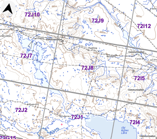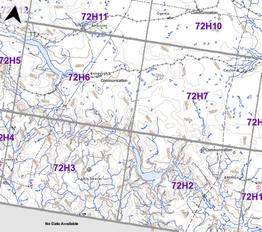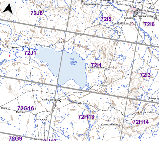 - Figure 6 illustrates the Wood River-Big Muddy Creek drainage divide area west of the figure 4 map area and south and west of the figure 5 map area and includes overlap areas with figures 4 and 5. Old Wives Lake is located in maps 72H14 and 72J1 and the south-oriented north extension of the Big Muddy Creek valley is located in maps 72H13 and 72H12. Remember drainage in the northern valley extension is today discontinuous drainage and the valley floor is today covered by shallow elongate lakes, although the valley at one time was the route of a continuous southeast and south-oriented melt water flood flow channel. The north-northeast oriented stream in maps 72G10, 72G15, and 72G16 (northwest corner) is the Wood River, which as seen in figure 5 flows to Old Wives Lake, and is the major drainage route in what is today the Old Wives Lake internal drainage basin. Note how the north-northeast oriented Wood River has northwest-oriented tributaries from the east. Note also areas of higher elevation in maps 72G7 and 72G8 and generally in the figure 6 southwest corner area. These higher elevations represent remnants of a topographic surface that once extended northward across the entire figure 6 map area. Melt water flood erosion lowered the surface north of the elongate lake in map 72G8, which is Twelve Mile Lake. Twelve Mile, while draining in a northwest direction today, is located in a former east-oriented flood flow channel which once drained to the Big Muddy Creek valley. North of Twelve Mile Lake the landscape has been eroded by southeast oriented ice-marginal melt water flood flow, which once moved to what was then the actively eroding Big Muddy Creek flood flow channel (located along the southwest margin of what was then the detached and decaying southwest margin of the former thick North American ice sheet). At the time flood waters were flowing across the figure 6 map area the deep northeast-oriented South Saskatchewan River valley did not yet exist and ice-marginal melt water flood waters were flowing to and along the ice sheet’s decaying margin. The north-northeast oriented Wood River valley was eroded by a reversal of flood flow triggered by headward erosion of the deep southeast and south-oriented Big Muddy Creek flood flow channel (perhaps aided by reversals of flood flow further to the north as northern drainage routes across the former ice sheet floor began to open up). The northwest-oriented Wood River tributary valleys were also eroded by reversals of flood flow on northwest ends of flood flow routes beheaded by headward erosion of the north-northeast oriented Wood River valley.