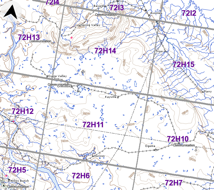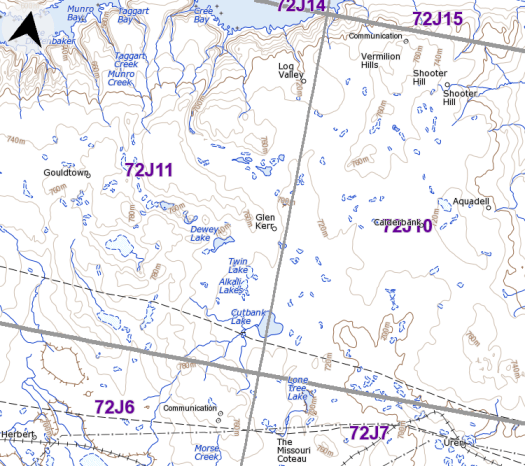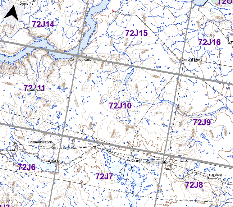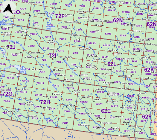 - The Missouri River drainage basin extends northward into southern Alberta and Saskatchewan and the south-oriented Big Muddy Creek drainage basin is the easternmost Missouri River drainage basin in southern Saskatchewan. The South Saskatchewan River is a major east and northeast-oriented river in Saskatchewan, which after joining the North Saskatchewan River forms the northeast-oriented Saskatchewan River, which flows to the northeast-oriented Nelson River, which in turn flows to Hudson Bay. In other words the South Saskatchewan River-Big Muddy Creek drainage divide area investigated in this essay is the north-south continental divide. Figure 1 is a Natural Resources Canada index map for 1:250,000 and 1:50,000 scale hard copy topographic maps of southern Saskatchewan (west of the Manitoba border). The border with the United States is where the index map grid ends. Numbers used to identify specific topographic map sheets will be useful in identifying locations of the topographic maps illustrated in the following discussion and also for identifying drainage routes, which frequently are not labeled. The South Saskatchewan River valley is flooded by Lake Diefenbaker in the figure 1 northwest corner area and is oriented in a northeast and northwest direction. A northwest oriented Lake Diefenbaker arm floods the valley of a northwest oriented tributary, which enters the South Saskatchewan River valley at Elbow. Lake Diefenbaker floods the northwest-oriented tributary valley to the point that a dam has been built at the southeast end of that Lake Diefenbaker arm to prevent South Saskatchewan River water from flowing down the southeast-oriented Qu’Appelle River valley. The Qu’Appelle River flows in a southeast direction to map 72I11 where it joins the northwest- and north-oriented Moose Jaw River and turns to flow in more of an east direction to the figure 1 east edge. East of figure 1 the Qu’Appelle River flows to east-oriented Assiniboine River, which joins the north-oriented Red River, with water eventually reaching the Nelson River. While not visible on figure 1 south and west of the southeast-oriented Qu’Appelle River valley is the northeast-facing Missouri Escarpment, which will be seen in the topographic maps below.