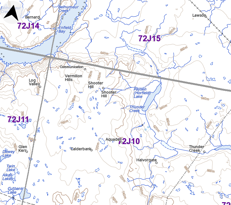 - Figure 9 illustrates in more detail (than figure 8) the South Saskatchewan River-Thunder Creek drainage divide area east of the northeast-facing Missouri Escarpment, which was seen in less detail in figure 8. Lake Diefenbaker, which floods the northeast-oriented South Saskatchewan River valley, is seen in the figure 9 northwest quadrant. Thunder Creek originates in map 72J15 as a west-oriented stream, but makes a U-turn to flow in a southeast direction to Paysen (Horfield) Lake and then to flow in a southeast and east direction to the town of Thunder Creek and the figure 9 east edge (south half). Note how the 100 meter plus high Missouri Escarpment is located west of Thunder Creek and south of the South Saskatchewan River valley. Thunder Creek in the figure 9 map area is flowing along the southwest margin of a northwest-southeast oriented broad lowland between the Missouri Escarpment and uplands defined by such areas as Last Mountain and the Moose Mountains (neither is seen in maps illustrated in this essay). Today the northwest end of this broad northwest-southeast oriented lowland is drained by southeast oriented Qu’Appelle River tributaries and headwaters. As seen in earlier figures in this essay southeast of the southeast oriented Qu’Appelle River tributaries and headwaters the northwest-southeast oriented broad lowland is drained by northwest-oriented Qu’Appelle River tributaries and further to the southeast by southeast oriented Souris River headwaters and tributaries. As previously mentioned the broad lowland can be followed in a southeast direction along the northeast-facing Missouri Escarpment base into central North Dakota and to the south-oriented James River lowland, which is a south-oriented broad lowland located east of the east facing Missouri Escarpment in south central North Dakota and central South Dakota. East of the James River lowland in South Dakota is the west-facing Prairie Coteau Escarpment and the Prairie Coteau upland, which is what remains of the east wall of the giant southeast and south-oriented ice-walled and bedrock-floored canyon. Remnant’s of the ice-walled and bedrock-floored canyon’s northeast wall in north central North Dakota and southern Saskatchewan include the Turtle Mountain, Moose Mountain, and Last Mountain southwest escarpments. Originally an immense river on the floor of this giant southeast- and south-oriented ice-walled and bedrock-floored canyon drained melt water floods from the rapidly melting ice sheet surface to the actively eroding Missouri River valley (downstream from southeast South Dakota). The opening up of east and north-oriented drainage routes across the decaying ice sheet floor captured this southeast-oriented flood flow first in southeast North Dakota to produce the present day Sheyenne River valley U-turn. Next the southeast-oriented melt water river was captured in north central North Dakota to create the Souris River U-turn. The southeast-oriented melt water river was captured again north and east of Moose Jaw by headward erosion of the east-oriented Qu’Appelle River valley. And next headward erosion of the deep northeast-oriented South Saskatchewan River valley beheaded and reversed southeast-oriented flood flow routes to the newly eroded Qu’Applelle River valley to erode the northwest-oriented South Saskatchewan River valley segment seen northwest of Elbow (seen in figure 1).