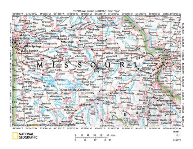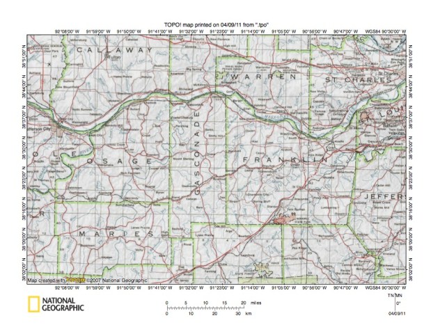 - Figure 1 shows a location map for the Gasconade River-Bourbeuse River drainage divide area in Osage, Gasconade, and Franklin Counties, Missouri. Missouri is the state occupying most of the figure 1 map area with Illinois being the state located east of the south-southeast oriented Mississippi River. The Missouri River flows in an east-northeast direction from Kansas City near the figure 1 west edge (north half) to Brunswick. At Brunswick the Missouri River turns to flow in a southeast, south, east, and southeast direction to Jefferson City. From Jefferson City the Missouri River flows in an east-northeast, southeast, and northeast direction to join the south-oriented Mississippi River as a barbed tributary (just downstream from a Mississippi River northward jog to meet the south-oriented Illinois River). The Osage River is an east- and northeast-oriented tributary joining the Missouri River near Jefferson City and the Harry S. Truman Reservoir and the Lake of the Ozarks are large reservoirs flooding the Osage River valley. The Gasconade River is a north-northesat oriented Missouri River tributary located east of the Osage River and flows from the figure 1 south center edge to join the Missouri River near the town of Gasconade (between Jefferson City and Washington). The Bourbeuse River is located east of the Gasconade River and originates near Rolla. For most of its course the Bourbeuse River meanders in a northeast direction before turning to flow in a south direction to join the Meramec River. The Meramec River originates south of Rolla and flows in a north and northeast direction to join the Bourbeuse River and then flows in an east-northest direction to the south side of St Louis where it turns to flow in a south direction to join the south-oriented Mississippi River. The Gasconade River-Bourbeuse River drainage divide area in Osage, Gasconade, and Franklin Counties is located south of the Missouri River, east of the Gasconade River, and west and north of the Bourbeuse River. The region immediately to the east is described in the Missouri River-Meramec River drainage divide area in St Louis and Franklin Counties, Missouri essay. Other regional essays can be found listed under the MO Missouri River or Gasconade River on the sidebar category list.