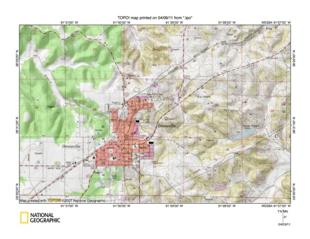 - Figure 5 illustrates the Third Creek-Red Oak Creek drainage divide area located east and north of the figure 3 map area and includes overlap areas with figure 3. Belle is the town located in the figure 5 southwest corner. Bland is located near the Osage, Maries, and Gasconade County corner east and slightly north from Belle. Owensville is the larger town located in the figure 5 east center. The Gasconade River flows in a north, east-southeast and northeast direction in the figure 5 northwest corner. Third Creek is the northwest, west, and northwest-oriented tributary originating north of Owensville and joining the Gasconade River at the elbow of capture where it turns from flowing in an east-southeast direction to flowing in a northeast direction. The east-southeast oriented Gasconade River valley segment was eroded headward along a captured southeast-oriented flood flow route while the northwest-oriented Third Creek valley was eroded by a reversal of flood flow on the northwest end of the beheaded flood flow route. Dry Fork meanders across the south edge of the figure 5 southeast quadrant and joins the meandering Bourbeuse River just south of the figure 5 southeast corner. A Bourbeuse River meander can be seen along the figure 5 east edge just north of the southeast corner. Red Oak Creek is a northeast-oriented stream in the figure 5 southeast quadrant located between Owensville and Dry Fork and just east of the figure 5 map area turns to flow in a southeast direction to join the Bourbeuse River. Note how Dry Fork tributaries are oriented in southeast directions and also how Red Oak Creek tributaries from the north are oriented in southeast directions. Further, note how southeast-oriented Red Oak Creek tributaries are aligned with northwest-oriented Third Creek tributaries and headwaters valleys. The figure 5 map contour interval is 20 meter and does not provide enough detail to show shallow through valleys. The Third Creek-Red Oak Creek drainage divide has a very gradual slope toward the northeast and appears to be a remnant of what was once a relatively smooth erosion and/or deposition surface. The smooth surface was probably developed as large volumes of south and/or southeast-oriented flood flow moved across the region. Flood waters were first captured by headward erosion of the deep Bourbeuse River valley south of the figure 5 map area. Next headward erosion of the deep Dry Fork valley captured the flood flow and beheaded flood flow routes to the newly eroded Bourbeuse River valley. Red Oak Creek valley headward erosion next beheaded flood flow routes to the newly eroded Dry Fork valley. Headward erosion of the deep Gasconade River next beheaded flood flow routes across the figure 5 map area causing a massive reversal of flood flow which eroded the northwest-oriented Third Creek valley and its tributary valleys.