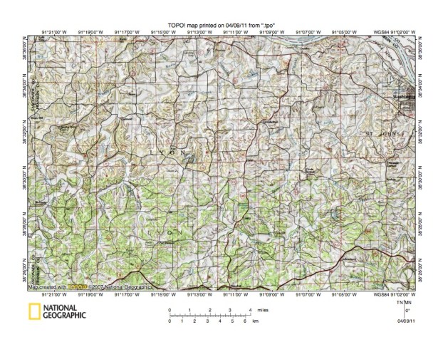 - Figure 9 uses a reduced size topographic map to illustrate the Boeuf Creek-St Johns Creek drainage divide area located east and south of the figure 7 map area and includes overlap areas with figure 7. Washington is the larger town straddling the east edge of the figure 9 northeast quadrant and is located on the southwest side of the southeast-oriented Missouri River valley. Casco is a much smaller town located in the figure 9 south center and south of Casco is St Johns Creek. From the Casco area St Johns Creek flows in an east direction and then meanders in a north and northeast direction to join the Missouri River just west of Washington. Note how St Johns Creek has south and southeast-oriented tributaries from the north and west and north and northwest oriented tributaries from the south and east and has northwest and southeast oriented valley segments. The north-northeast-oriented stream meandering from the figure 9 southwest corner into the figure 9 northwest quadrant and then turning to meander in an east and north direction to join the Missouri River near the small town of Dundee (south of the east-oriented Missouri River segment seen along the figure 9 north edge). The north-oriented tributary meandering immediately to the east of Boeuf Creek is Cedar Fork and Middle Fork is the north and north-northwest oriented tributary flowing to Cedar Fork. West and slightly south of Casco is the small town of Port Hudson, which is located on the Middle Fork-St Johns Creek drainage divide. Note how northwest-oriented Middle Fork headwaters valleys are aligned with southeast-oriented St Johns Creek headwaters valleys in the Port Hudson region. The figure 9 map contour interval is 20 meters which does not show shallow through valleys well, although evidence for shallow through valleys can be seen north of Port Hudson. More detailed topographic maps, not illustrated in this essay, show the through valleys much better. On the more detailed maps where contour intervals are in feet there is an isolated high point greater than 890 feet on the drainage divide about three miles north of Port Hudson (grid lines on the figure 9 map define one mile squares). Proceeding south from that high point towards Port Hudson the drainage divide elevation drops to less than 830 feet and then fluctuates, although it never exceeds 860 feet until south of Port Hudson where it rises to more than 900 feet. The low drainage divide elevations between the isolated 890 plus foot elevation in the north and the 900 foot elevations south of Port Hudson define what was once the floor of a southeast-oriented flood flow channel to what was then the actively eroding St Johns Creek valley. Southeast-oriented flood flow in that channel was beheaded and reversed by headward erosion of the east-oriented Boeuf Creek valley, which triggered the flood flow reversal responsible for headward erosion of the north-oriented Middle Fork, Cedar Fork, and Boeuf Creek valleys.