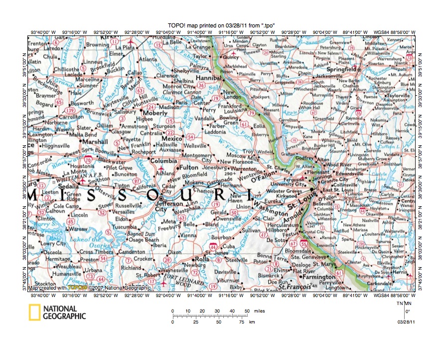 Figure 1: Mississippi River-Missouri River drainage divide area location map (select and click on maps to enlarge). National Geographic Society map digitally presented using National Geographic Society TOPO software.