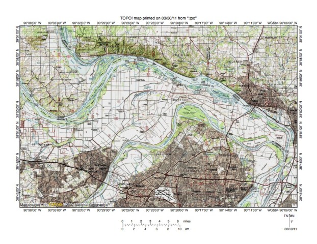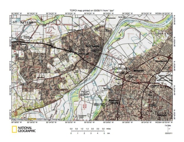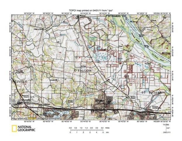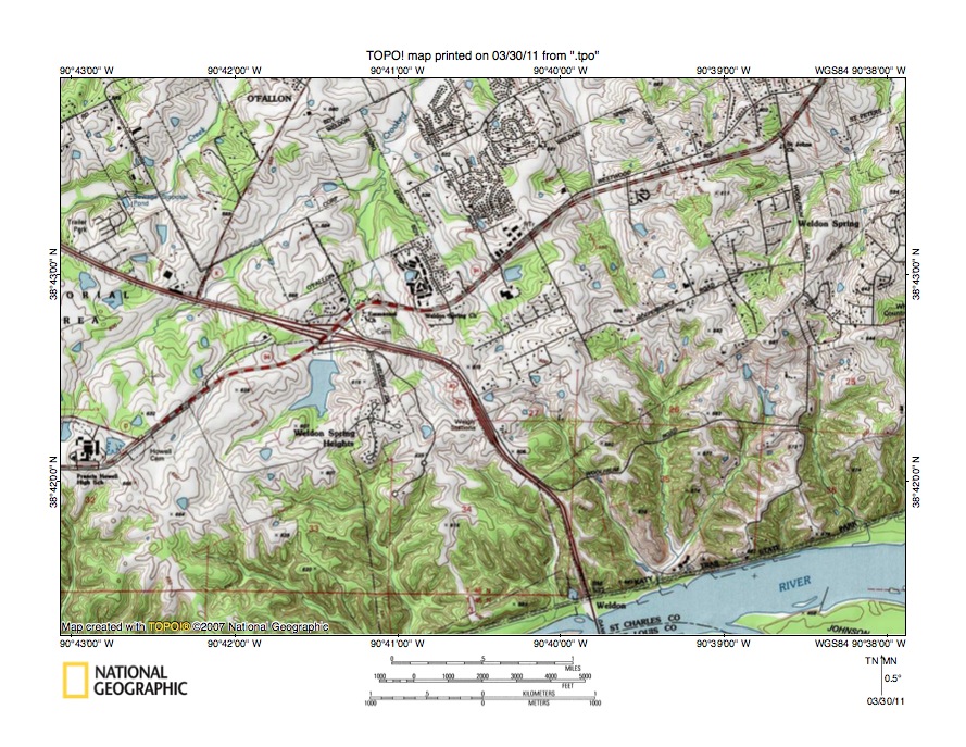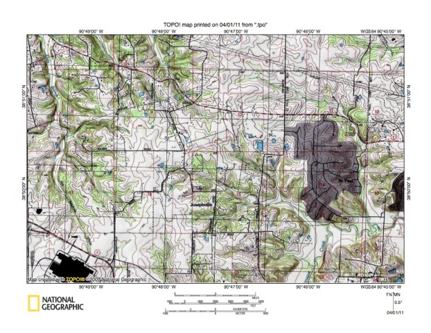 Figure 4: Mississippi River-Dardenne Creek drainage divide area. United States Geological Survey map digitally presented using National Geographic Society TOPO software.