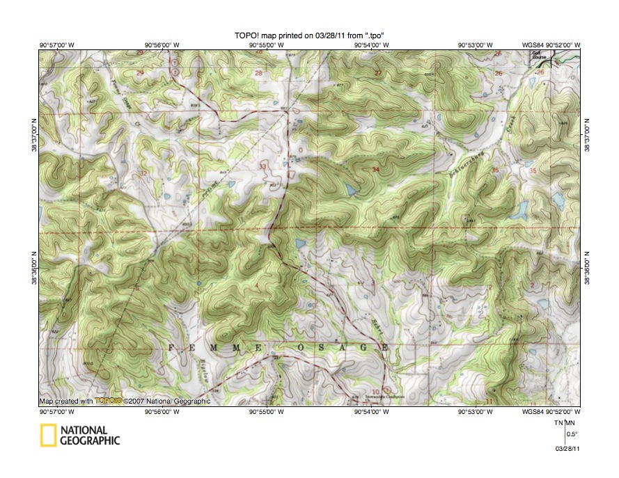 Figure 10: Detailed map of Femme Osage Creek-Bigelow Creek drainage divide area. United States Geological Survey map digitally presented using National Geographic Society TOPO software.
