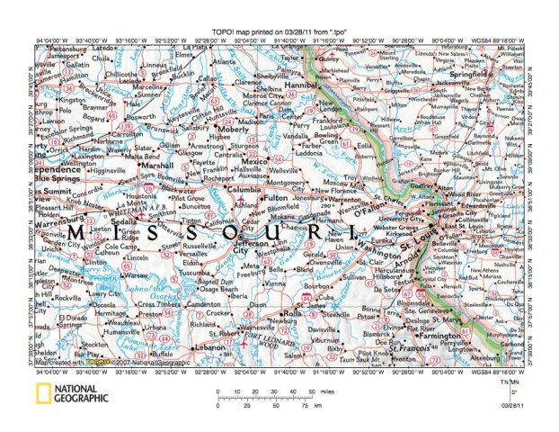 Figure 9: Callaway Fork-Missouri River drainage divide area. United States Geological Survey map digitally presented using National Geographic Society TOPO software.
