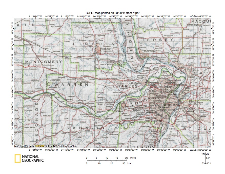 Figure 1: Peruque Creek-Missouri River drainage divide area location map (select and click on maps to enlarge). National Geographic Society map digitally presented using National Geographic Society TOPO software.