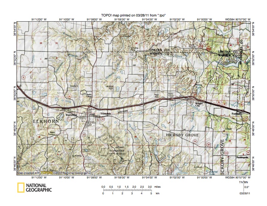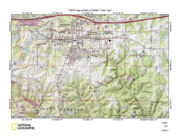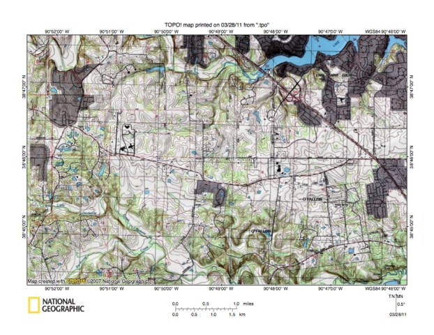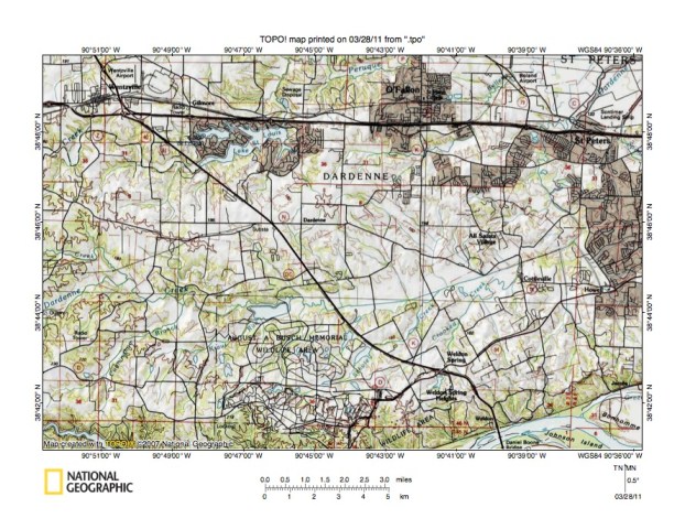 Figure 7: Peruque Creek-Dardenne Creek drainage divide area. United States Geological Survey map digitally presented using National Geographic Society TOPO software.
