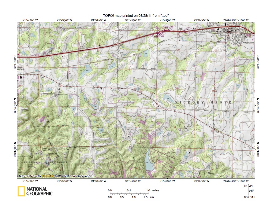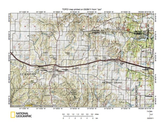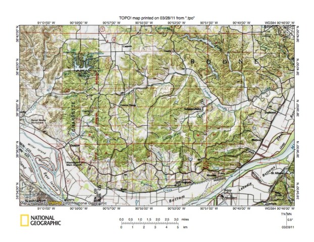 Figure 5: Peruque Creek-Charrette Creek drainage divide area. United States Geological Survey map digitally presented using National Geographic Society TOPO software.