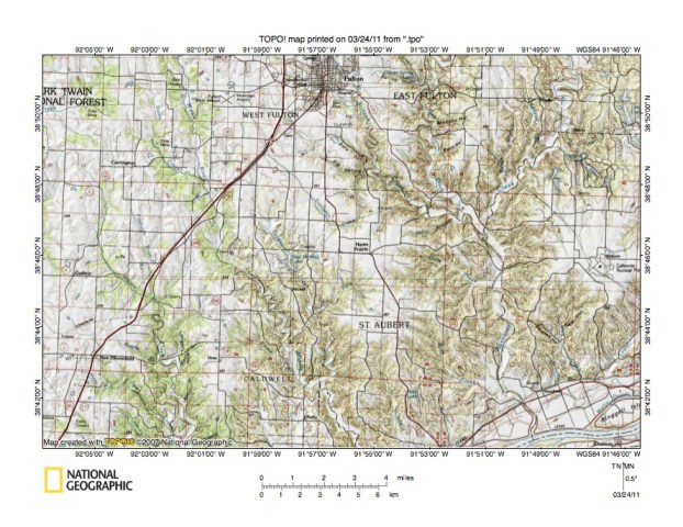 Figure 9: Auxvasse Creek-Richland Creek drainage divide area. United States Geological Survey map digitally presented using National Geographic Society TOPO software.