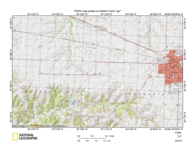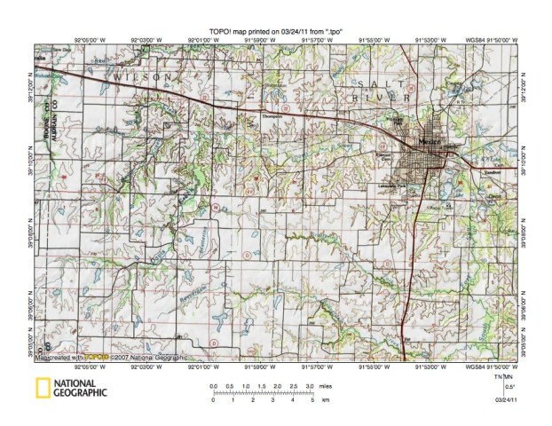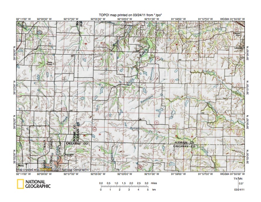 Figure 10: Middle River-Auxvasse Creek drainage divide area. United States Geological Survey map digitally presented using National Geographic Society TOPO software.