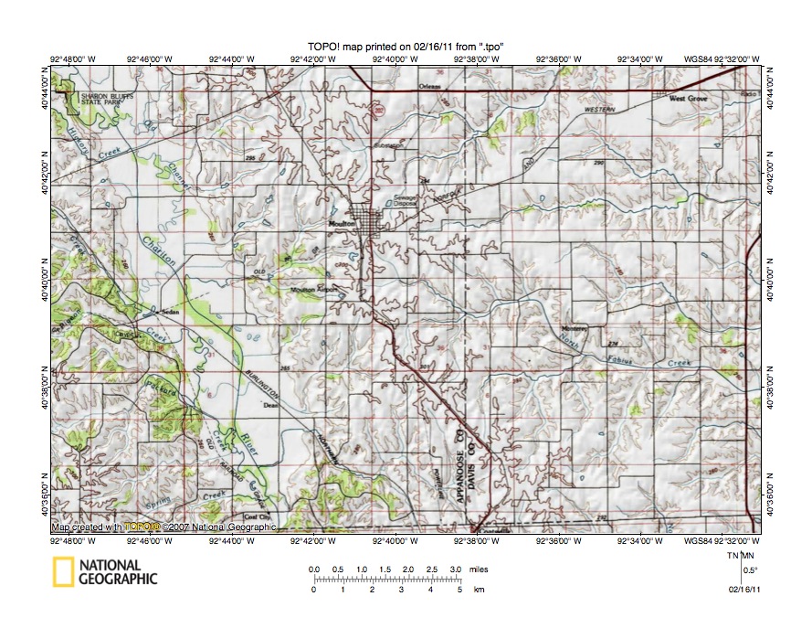 - Figure 10 illustrates the Chariton River-North Fabius River drainage divide area south and east of the figure 3 map area and east of the figure 9 map area (and includes overlap areas with both figures 3 and 9). Moulton is the town located just north of the figure 10 center. The Chariton River flows in a south-southeast direction from the Sharon Bluffs State Park located in the figure 10 northwest corner to the figure 10 south edge (west of center). The Fox River originates near Moulton and flows in a northeast direction to the figure 10 north edge (east half). North and east of the figure 10 map area the Fox River turns to flow in a southeast direction to join the Mississippi River. The southeast, east, and east-southeast oriented stream originating near Moulton is North Fabius Creek, which flows to the southeast-oriented North Fabius River, which after flowing parallel to the southeast-oriented Middle Fabius River and South Fabius River (headwaters located south of the figure 10 map area) joins those branches to form the Fabius River which then flows to the Mississippi River. The east-oriented stream originating near Moulton is Carter Creek, which east of the figure 10 map area turns to flow in a southeast direction to join the southeast-oriented North Fabius River. West Grove is a small town located in the figure 10 northeast corner. Just south of West Grove are headwaters of an east-northeast oriented stream. That stream east of the figure 10 map area turns to flow in a southeast direction and to become the South Wyaconda River. After flowing parallel to the adjacent southeast-oriented North Wyaconda River the two branches join to form the Wyaconda River, which flows directly to the Mississippi River. What we are seeing in figure 10 is headwaters of multiple closely spaced and parallel southeast-oriented Mississippi River tributaries located almost on the banks of the south-southeast oriented Chariton River. The closely spaced, elongate, and parallel Mississippi River tributary valleys suggests those tributary valleys originated as channels in what was once a large-scale southeast-oriented anastomosing channel complex which eroded headward from the actively developing Mississippi River valley. The figure 10 (and figure 3) evidence suggests headward erosion of the deep south-southeast and south oriented Chariton River valley beheaded and captured those anastomosing southeast-oriented flood flow channels and diverted the southeast-oriented flood flow to the actively eroding Missouri River valley located south of the figure 10 map area.