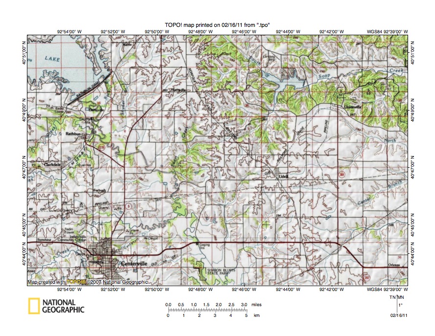 - Figure 3 illustrates the South Soap Creek-Chariton River drainage divide area north and east of Centerville, Iowa. Centerville is the large town located in the figure 3 southwest quadrant. The southeast end of Rathbun Lake and Rathbun Dam are located in the northwest quadrant and the Chariton River flows in a south-southeast direction from Rathbun Dam to the figure 3 south center edge. Udell is the much smaller town located east and south of the figure 3 center. The reservoir located north of Udell is located on southeast and east oriented South Soap Creek, which flows to the figure 3 east edge (just south of northeast corner) and then to Soap Creek, which flows to the Des Moines River. Note the north-oriented tributary originating near Udell and flowing to the reservoir in the South Soap Creek valley. The north oriented tributary valley is linked by a shallow through valley with a southwest and south oriented Chariton River tributary. The through valley provides evidence of a south-oriented flood flow route to what was then the actively eroding Chariton River valley (and Missouri River valley) prior to headward erosion of the deep South Soap Creek valley. Headward erosion of the South Soap Creek valley (from the actively eroding Soap Creek valley and Des Moines River valley) beheaded the flood flow route and diverted the south-oriented flood flow from the developing Missouri River drainage system to the developing Des Moines River drainage system. Flood waters on the north end of the beheaded flood flow route eroded the north-oriented tributary valley. Just east of the north-oriented South Soap Creek tributary valley, on the upland at the edge of the east oriented South Soap Creek valley, are northeast-oriented headwaters of east-southeast oriented North Fox Creek, which flows to the southeast-oriented Fox River, which flows directly to the Mississippi River. The east-oriented stream flowing to the figure 3 east edge south of North Fox Creek are Fox River tributaries. Note how the South Soap Creek valley floor is approximately 20 meters deeper than the erosion (deposition?) surface on which the adjacent North Fox Creek headwaters originate. This evidence suggests headward erosion of the deep South Soap Creek valley beheaded flood flow routes to the actively eroding Fox Creek valley, which the west end of which had previously been captured by headward erosion of the deep south-oriented Chariton River valley. The lack of any significant east-oriented Chariton River tributary valleys in the figure 3 map area provides further evidence supporting this flood capture interpretation. In summary, the figure 3 map evidence suggests south-oriented flood flow moving across the figure 3 map area was first captured by headward erosion of east-oriented tributary valleys from the southeast-oriented Fox River valley, which had eroded headward from the Mississippi River valley. Second, headward erosion of the deeper Chariton River valley from the Missouri River valley captured the west ends of the developing east-oriented Fox River tributary valleys. Finally headward erosion of the deep South Soap Creek valley from the Des Moines River valley captured a developing south-oriented flood flow route just west of Udell to the south-oriented Chariton River valley.