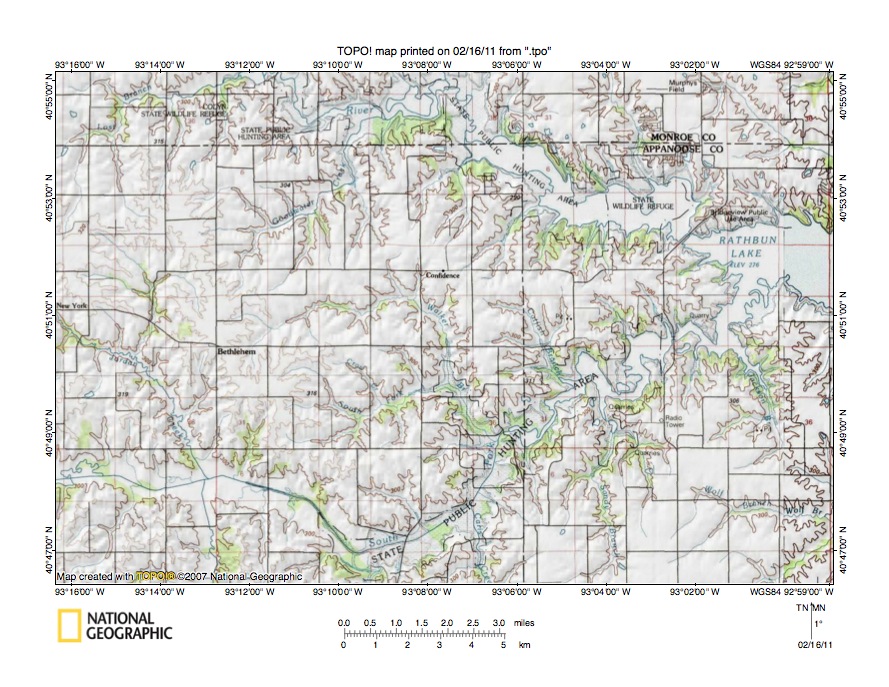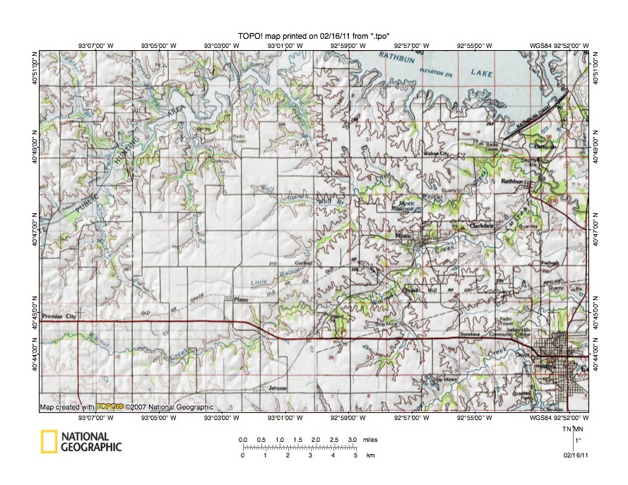 - Figure 7 illustrates the South Fork Chariton River-Walnut Creek drainage divide area located south and east of the figure 5 map area and west of the figure 3 map area (and includes overlap areas with both figures 3 and 5). Rathbun Dam is located in the figure 7 northeast corner area and Centerville is the town located near the southeast corner. The South Fork Chariton River flows in a northeast direction from the figure 7 west center edge to the north center edge. Walker Branch is the south-southeast oriented tributary flowing from the figure 7 northwest corner. Labeled north-northwest oriented South Fork Chariton River tributaries from the northeast to southwest are Jackson Branch, Sandy Branch, and Carls Creek. Promise City is a town name located along the figure 7 west edge (south half). Walnut Creek flows from the west edge (south of Promise City) to the figure 7 south center area where it turns to flow in a northeast direction to join the Chariton River near the town of Rathbun (located a short distance downstream from Rathbun Dam). Mystic is a town located on the north side of Walnut Creek in the figure 7 east center area and Plano is a small town located north of Walnut Creek in the figure 7 south center area. Clarkdale is a small town in the Walnut Creek valley located between Mystic and Rathbun. Little Walnut Creek is northeast-oriented flowing just north of Plano and making a jog in an east-southeast direction north of Mystic before resuming its northeast-oriented flow to join the Chariton River between Rathbun Dam and the town of Rathbun. Cooper Creek is the northeast-oriented stream flowing across the figure 7 southeast corner (just north of Centerville). Note how orientations of Little Walnut Creek tributaries suggest linkages with the north-northwest oriented South Fork Chariton River tributaries. While through valleys are not deep enough to appear on this 20-meter contour interval map more detailed topographic maps illustrate shallow through valleys linking the north-northwest oriented Jackson Branch valley with the valley of a southeast oriented Walnut Creek tributary and also linking a northwest-oriented Sandy Branch tributary valley with the southeast and east-oriented Wolf Branch (of Little Walnut Creek) valley. A close look at figure 7 also reveals shallow through valleys linking northwest-oriented Little Walnut Creek tributary valleys with southeast- and east-oriented Walnut Creek tributary valleys (in the region between Clarkdale and Centerville). Detailed topographic maps of the region also reveal additional shallow through valleys. The valley orientations combined with the shallow through valleys provide further evidence that south- and southeast-oriented flood flow was first captured by headward erosion of the Walnut Creek valley, next by headward erosion of the Little Walnut Creek valley, and finally by South Fork Chariton River valley headward erosion.