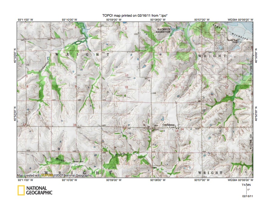 - Figure 6 illustrates a detailed topographic map of the Goodwater Creek-Walker Branch drainage divide area seen in less detail in figure 5 above. The southwest edge of Rathbun Lake, which floods the southeast-oriented Chariton River valley, can be seen in the figure 6 northeast corner. Confidence is the small cluster of buildings in the section 14 center (figure 6 southeast quadrant). Walker Branch is the east-northeast oriented stream flowing from the figure 6 southwest corner and then turning to flow in a southeast direction to the figure 6 south edge (south of Confidence). Note south and southeast oriented Walker Branch tributaries from the north. Goodwater Creek flows in a northeast direction from the figure 6 west center edge to the section 4 southeast quadrant and then turns to flow in a north-northwest direction to the north edge and Rathbun Lake. Note north, north-northwest, and northwest oriented Goodwater Creek tributaries from the south. In section 10 (northwest of Confidence) a shallow northwest-southeast oriented through valley links the valley of a north-northwest oriented Goodwater Creek tributary with the valley of a south-southeast oriented Walker Branch tributary. The valley is defined by three 10-foot contour lines on the west and two contour lines on the east. The through valley provides evidence of a south-southeast oriented flood flow route prior to headward erosion of the deep Goodwater Creek valley. The Goodwater Creek valley eroded headward from the deep southeast-oriented Chariton River valley and the north-northwest oriented Goodwater Creek valley segment and tributary valley were eroded by reversals of flood flow on the north-northwest end of a beheaded flood flow route. The south-southeast oriented flood flow route had been moving water to the actively eroding Walker Branch valley. While relief on the figure 6 upland surface is low evidence of other through valleys can also be found. For example north of Confidence in sections 12, 11, and 2 is a north-northwest and north-northeast oriented Chariton River tributary and shallow through valleys can be seen in section 12 linking that north-northwest oriented tributary valley with a northeast-oriented Chariton River tributary valley to the southeast. These through valleys are defined by a single 10-foot contour line on each side, but provide evidence of at least two south-southeast oriented flood flow routes prior to the reversal of flood flow (caused by headward erosion of the deep Chariton River valley). Valley orientations provide evidence of additional flood flow routes.