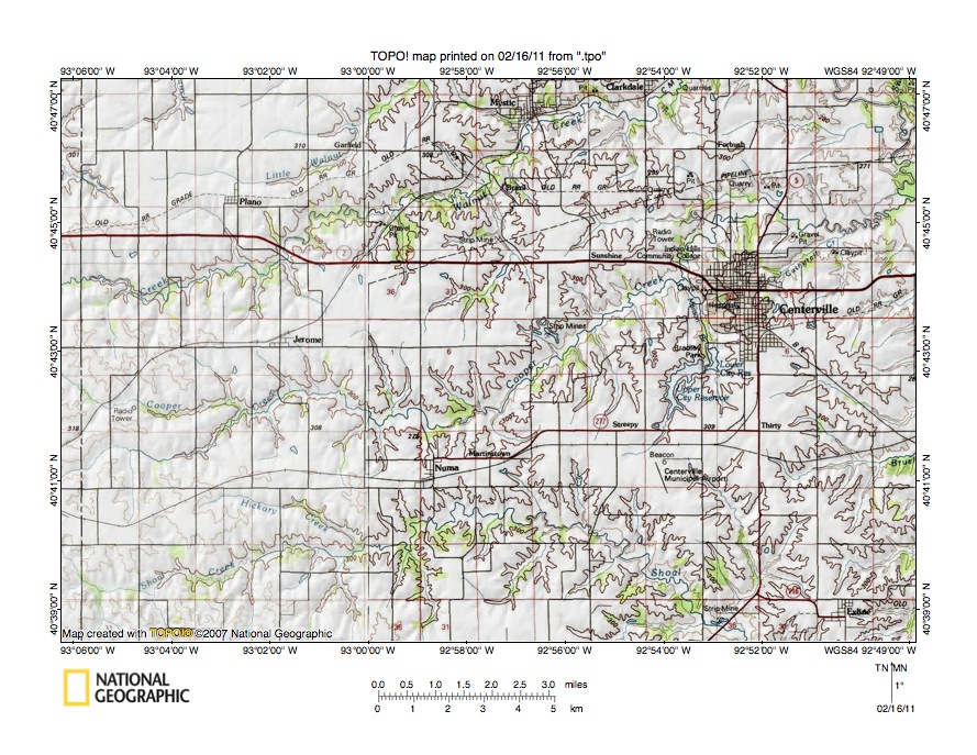 - Figure 9 illustrates the Shoal Creek-Little Shoal Creek drainage divide area south and slightly east of the figure 8 map area and includes overlap areas with figure 8. The west-east oriented Appanoose-Putnam County line (also the Iowa-Missouri state line) is located near the figure 9 south edge. The south-southeast oriented Chariton River is located in the figure 9 northeast corner area. Numa is located in the northwest quadrant and Cooper Creek is the east-oriented stream seen near the figure 9 edge just north of Numa. Shoal Creek is the east-oriented stream just south of Numa and turns to flow in a southeast and south direction to the figure 9 south edge (just east of center) and south of the figure 9 map area turns again to flow in a southeast direction to the south-oriented Chariton River. Cincinnati is a small town near the figure 9 center. Little Shoal Creek originates just west of Cincinnati and flows in a south-southeast, southeast and east direction around the Strip Mines near the figure 9 south center edge and joins Shoal Creek just south of the south edge. North Creek is an east-southeast oriented Little Shoal Creek tributary flowing from the figure 9 west edge (just south of center) and South Creek is the east-oriented Little Shoal Creek tributary located just to the south. Note how in the figure 9 west center area a north-northwest oriented Shoal Creek tributary is aligned with a southeast-oriented North Creek tributary. Other linkages between Shoal Creek tributaries and Little Shoal Creek tributaries can also be made. Again the map 20-meter contour interval does not show shallow through valleys which in spite of the regional low relief are sometimes visible on more detailed topographic maps. The figure 9 map evidence, based on valley orientations and linkages of north- and south-oriented tributaries, suggests headward erosion of the Little Shoal Creek valley and its east-oriented South Creek and North Creek tributary valleys occurred slightly in advance of headward erosion of the Shoal Creek valley to the north (the south-southeast oriented valley segments may have eroded headward at the same time). Headward erosion of the east-oriented Shoal Creek valley beheaded south- and southeast-oriented flood flow to the newly eroded and actively eroding Little Shoal Creek and tributary valleys with Copper Creek headward erosion next beheading flood flow to the newly eroded Shoal Creek valley.
