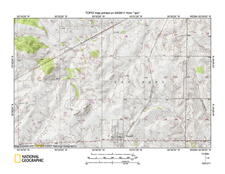- Figure 10 provides a detailed map of the Big Creek-Shootman Creek drainage divide area seen in less detail in the figure 9 map area. Bogard is the town located near the figure 10 south center edge. Big Creek flows across section 14 (in the figure 10 northwest quadrant) and then turns in section 13 to flow in an east-northeast direction across section 18 to the figure 10 north edge. Note the north-northeast oriented Big Creek tributary flowing through section 19 to join Big Creek just north of the figure 10 north edge. Shootman Creek originates in section 21 (near east edge) and flows in a south-southeast direction into section 28 and to the figure 10 east edge. The southeast-oriented stream in the section 29 northeast quadrant and flowing across the section 28 southwest corner to the figure 10 south edge (near southeast corner) is a Shootman Creek tributary. Note how in section 20 a southeast-oriented Shootman Creek tributary valley is linked by a through valley to a northwest-oriented tributary valley to the previously mentioned north-northeast oriented Big Creek tributary valley. The through valley floor elevation is between 810 and 820 feet (the map contour interval is 10 feet). Mound Bogard to the west rises to more than 950 feet while elevations in the section 20 northeast quadrant rise to at least 860 feet. The south-oriented stream originating directly south of Mound Bogard in section 25 is McGill Creek, which south of figure 10 flows directly in a south-southwest direction to Wakenda Creek, which is flowing along the north edge of the Missouri River valley. Note through valleys immediately east of Mound Bogard in the section 25 northeast quadrant linking the south-oriented McGill Creek valley with north-oriented Big Creek tributary valleys. The through valley floor elevations are again between 810 and 820 feet. The south-southwest oriented stream originating in section 26 west of Mound Bogard is a McCroskie Creek tributary, and south of the figure 10 map area McCroskie Creek flows in a south-southwest direction to join Wakenda Creek, which is flowing along the north edge of the Missouri River valley. Note the through valleys in the section 25 northwest corner and the section 23 southeast corner linking the McCroskie Creek tributary valley with north-oriented Big Creek tributary valleys. The through valley floor elevations are between 840 and 850 feet, but as already mentioned Mound Bogard in section 25 rises to at least 950 feet while an unnamed mound in the section 23 northeast quadrant rises to at least 940 feet. The through valleys provide evidence of multiple south-oriented flood flow channels, which were beheaded and captured so as to create the east-northeast oriented Big Creek valley segment, which had been beheaded and reversed by headward erosion of the Big Creek valley from the newly eroded Grand River valley 9 see figures 2 and 9).
