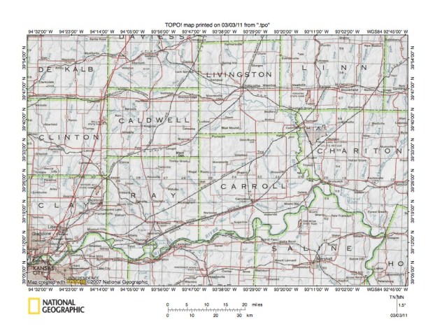 - Figure 1 provides a location map for the Grand River-Missouri River drainage divide area in Livingston and Carroll Counties, Missouri. The state of Missouri is labeled and Iowa is the state north of Missouri. The south-southwest and south-southeast oriented Mississippi River forms the Iowa and Missouri eastern border and Illinois is the state east of the Mississippi River. Kansas is the state located in the figure 1 southwest corner and the tip of the Nebraska southeast corner can be seen north of Kansas along the figure 1 west edge. The Missouri River flows in a southeast direction along the Missouri western boundary to Kansas City and then turns to flow in an east-northeast direction to Brunswick, Missouri. From Brunswick the Missouri River flows in a southeast direction to Jefferson City (along figure 1 south edge) and then in an east direction to the figure 1 east edge. East of figure 1 the Missouri River joins the south-oriented Mississippi River, which flows to the Gulf of Mexico. The Grand River originates in Iowa just north of the figure 1 map area and flows in a south direction through Diagonal, Iowa (in figure 1 northwest quadrant) and then to Albany, Missouri. Near Albany the Grand River turns to flow in a southeast direction and when north of Brunswick turns to flow in south direction to join the Missouri River near Brunswick. Note how the southeast-oriented Grand River segment has several roughly parallel south-oriented tributaries, including the south-southeast oriented Thompson River. The Grand River-Missouri River drainage divide area in Livingston and Carroll Counties is the region south and west of the Grand River, north of the Missouri River, and east of a north-south line extending from Breckenridge through Braymer to Norborne. The Shoal Creek-Missouri River drainage basin landform origins in Caldwell, Ray, and Carroll Counties essay has described the region immediately to the west. This essay and essays describing other surrounding drainage divide areas can be found listed under MO grand River and/or MO Missouri River on the sidebar category list.