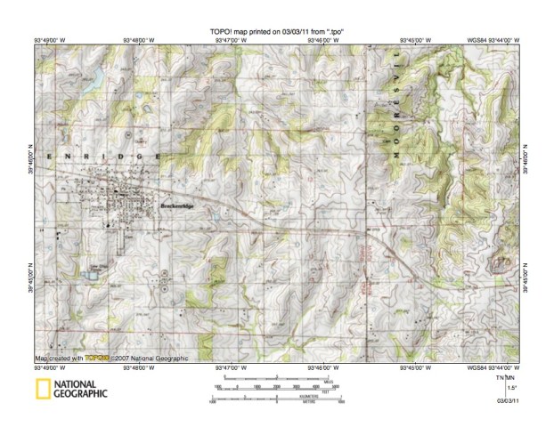 - Figure 4 provides a detailed topographic map of the Big Branch-Shoal Creek drainage divide area seen in less detail in figure 3 above. The labeled north-south boundary between Range 26 West and Range 25 West located in the figure 4 east half is also the boundary between Caldwell County (west) and Livingston County (east). The north-oriented stream originating in the section 11 southeast quadrant and flowing through section 2 to the figure 4 north center edge is Big Branch, which north of the figure 4 map area turns to flow in a northeast direction to join the southeast-oriented Grand River. Note how Big Branch has northwest-oriented tributaries from the east and northeast-oriented tributaries from the west. The east and south oriented stream originating in the section 11 southwest quadrant and flowing in a south direction near the section 14 east border to the figure 4 south edge is a tributary to southeast-oriented Panther Creek, although its joins Panther Creek along the north edge of the Shoal Creek valley. Since the stream flows independently to the Shoal Creek valley north edge it is here considered to be located in a valley which eroded headward from the Shoal Creek valley and hence is described as a Shoal Creek tributary. Note how the south-oriented Shoal Creek tributary valley is linked by a through valley in the section 11 southeast quadrant with the north-oriented Big Branch valley. The map contour interval is 4 meters and the through valley floor elevation is between 260 and 264 meters. Elevations in the section 12 southeast quadrant rise to at least 284 meters and elevations in the Breckenridge city limits also rise to more than 284 meters. In other words the through valley is at least 20 meters deep and provides evidence of a south-oriented flood flow channel which existed prior to headward erosion of the deep Grand River valley (north of the figure 4 map area). At the time the through valley was eroded flood waters were flowing to the actively south-oriented Shoal Creek tributary valley, which had eroded headward from what was then the newly eroded Shoal Creek valley. Headward erosion of the deep southeast-oriented Grand River valley and its northeast-oriented Big Branch tributary valley beheaded the south-oriented flood flow channel. Flood waters on north ends of the beheaded diverging south-oriented flood flow routes reversed flow direction to erode the north-oriented Big Branch valley segment and its tributary valleys.
