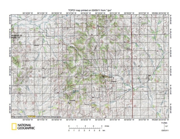 - Figure 6 provides a detailed topographic map of the north-oriented Mound Creek-south-oriented Mound Creek drainage divide area seen in less detail in figure 5 above. Blue Mound is the town in the northwest quadrant. The north-oriented Mound Creek originates in section 1 and flows in a northeast direction across the section 36 southeast quadrant, the section 31 northwest quadrant, and the section 30 southeast quadrant to the figure 6 north center edge. North of the figure 6 map area north-oriented Mound Creek as seen in figure 5 flows to the east-southeast oriented Grand River. Note how the north-oriented Mound Creek valley has southeast-oriented tributaries in section 36 and section 29. The southeast-oriented barbed tributaries provide evidence of what were once southeast-oriented flood flow channels captured by headward erosion of the deep northeast-oriented north-oriented Mound Creek headwaters valley. The south-oriented Mound Creek originates in the section 1 east half and flows in a northeast direction into section 6 where it turns to flow in a southeast and east direction into section 5. Once in section 5 the stream flows in a northeast direction to the northeast corner and then flows in a southeast direction to the figure 6 east edge (just north of southeast corner). South and east of figure 6 the south-oriented Mound Creek flows in a southeast direction to Bridge Creek with water eventually reaching the Grand River near where the Grand River enters the Missouri River. Note how the north-oriented Mound Creek valley is linked to the south-oriented Mound Creek valley by multiple through valleys. The deepest through valley is located in the section 31 southeast quadrant and has a valley floor elevation of between 850 and 860 feet (the map contour interval is 10-feet). Elevations north and east of the through valley rise to more than 890 feet while to the south and west elevations rise to more than 910 feet. The through valley links a northwest-oriented tributary valley to the north-oriented Mound Creek with a southeast-oriented tributary valley to the south-oriented Mound Creek. Another well-defined through valley is located in the section 6 northwest quadrant and has a valley floor elevation of between 870 and 880 feet. Elevations directly to the northeast rise to more than 910 feet while elevations to the southwest rise to more than 960 feet. A shallower through valley can be seen in the section 32 northwest quadrant and links a northwest-oriented tributary valley with a southeast-oriented tributary valley. The through valleys provide evidence of southeast-oriented flood flow channels to what was once the actively eroding southeast-oriented Mound Creek valley. These southeast-oriented flood flow channels were beheaded by headward erosion of the deep north-oriented Mound Creek valley, which was eroded headward by flood waters which were reversed when the deep Grand River valley beheaded south-oriented flood flow routes to the figure 6 map area.
