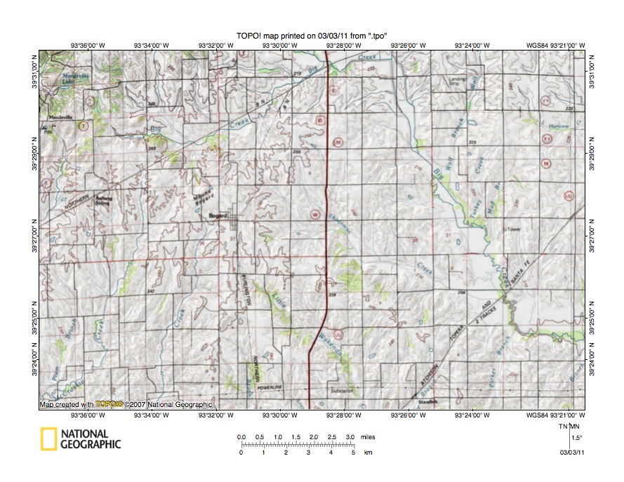 - Figure 5 uses a reduced size topographic map to illustrate Grand River-Bridge Creek drainage divide area south and east of the figure 3 map area. Hale is the town located in the figure 5 southeast quadrant and Avalon is the smaller town located near the figure 5 center. Utica is the town straddling the figure 5 west edge near the northwest corner. The Grand River flows in an east-southeast direction across much of the figure 5 north half and then flows in a south direction near the figure 5 east edge. Shoal Creek is the northeast-oriented Grand River tributary in the northwest corner area. Bedford is a town just south of the Grand River in the figure 5 northeast quadrant. Note north oriented Grand River tributaries from the south. Named tributaries from east to west are northeast-oriented Campbell Creek, northeast-oriented Johnson Creek, north and northwest oriented Wolf Grove Creek, north oriented Mound Creek, and north-oriented Brush Creek. These barbed tributaries, especially the north- and northwest-oriented tributaries are flowing in valleys eroded by reversals of flood flow on north ends of south-oriented flood flow routes beheaded by Grand River valley headward erosion. Note how these north-oriented Grand River tributaries are linked to south-oriented streams flowing to the figure 5 south edge. For example, south and west of Avalon are east- and northeast-oriented headwaters of south-southeast oriented Bridge Creek, which flows to the figure 5 south edge (east of center). South of the figure 5 map area Bridge Creek turns to flow in a south-southwest direction to join south-southeast, east, and northeast oriented Big Creek, which flows to the Grand River a short distance upstream from where the Grand River joins the Missouri River. Buris Creek is a south-oriented Bridge Creek tributary located between Avalon and Hale. Note how the Buris Creek headwaters are linked by a through valley with north-northeast oriented Campbell Creek headwaters valley. The through valley provides evidence of a south-oriented flood flow channel which was beheaded and reversed by Grand River valley headward erosion. West of the south-oriented Bridge Creek segment is southeast-oriented Mound Creek, which flows to the figure 5 south center edge and then joins Bridge Creek south of the figure 5 map area. This south-oriented Mound Creek valley is linked by through valleys with the north-oriented Mound Creek, which flows to the Grand River. Figure 6 below provides a detailed map of the Mound Creek-Mound Creek drainage divide area to better illustrate the somewhat more complicated through valley relationship in that region.