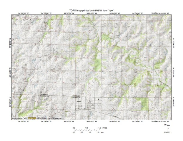 Figure 3: East end of Grand River-Shoal Creek drainage divide area. United States Geological Survey map digitally presented using National Geographic Society TOPO software.