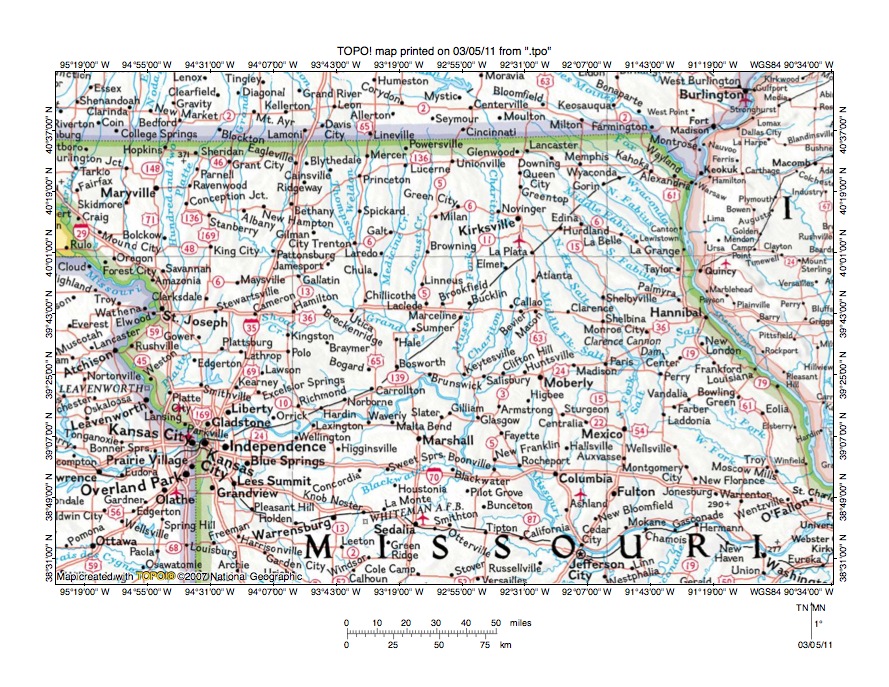 Figure 1: Grand River-Shoal Creek drainage divide area location map (select and click on maps to enlarge). National Geographic Society map digitally presented using National Geographic Society TOPO software.