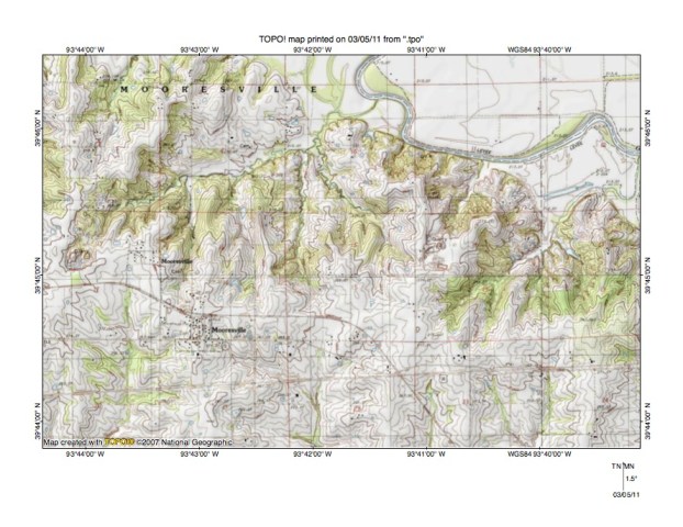Figure 4: Detailed map of Grand River-Shoal Creek drainage divide area near Mooresville. United States Geological Survey map digitally presented using National Geographic Society TOPO software.