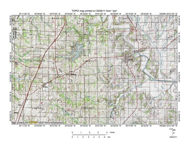 Figure 2: Detailed location map for Grand River-Shoal Creek drainage divide area. United States Geological Survey map digitally presented using National Geographic Society TOPO software.