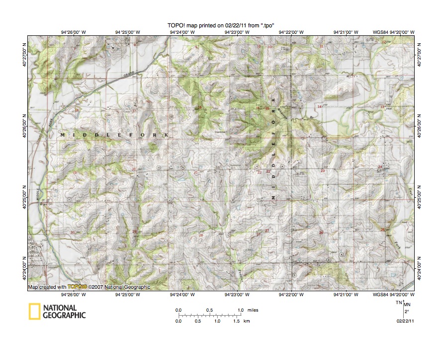 - Figure 7 illustrates the Platte River-East Fork Grand River drainage divide area east and slightly south of the figure 5 map area and includes overlap areas with figure 5. Grant City is the larger town in the figure 7 south center area. The Platte River flows in a south-southwest direction from the figure 7 north edge (west of center) to the figure 7 west center edge. Blockton is the small town located on the east side of the Platte River valley near the north edge. The Platte Branch flows in a south-southeast direction from the figure 7 northwest corner to join the Platte River near Athelstan. East of the Platte River, and flowing from the figure 7 north center edge in a south-southwest and south direction to the south edge (west half), is the Grand River. The south-southwest oriented stream east of Grant City is the Middle Fork Grand River. Marlowe Creek is the south-oriented stream east of Grant City and joins the Middle Fork Grand River south of the figure 7 map area. After Marlowe Creek joins it the Middle Fork flows in a south-direction to join the Grand River, which south of the figure 7 map area turns to flow in a southeast direction. The south-southwest oriented stream east of the Middle Fork Grand River is the East Fork Grand River, which also joins the Grand River south of the figure 7 map area. The south-southwest oriented Middle Fork tributary flowing from the figure 7 northeast corner is Fietchall Creek. Lotts Creek is the south-southwest oriented East Fork Grand River tributary flowing from the figure 7 east center edge. Note how the multiple south-southwest and south oriented streams in the figure 7 map area have narrow and elongate drainage basins and the Grand River tributary valleys are oriented in a south-southwest directions, at least in their upper reaches. The closeness of these parallel valleys suggests they originated as channels in an anastomosing channel complex, the east half of which was captured by headward erosion of the deep southeast-oriented Grand River valley (see figures 1 and 2) while the west half continued to flow in a south and south-southwest direction to the newly eroded Missouri River valley. Study of the figure 7 drainage divides also reveals shallow through valleys linking tributary valleys. For example along the Grand River-Marlowe Creek drainage divide west and northwest of Grant City there are easy to identify through valleys, some of which are defined by two 10-meter contour lines. Or near the town of Redding (near the figure 7 north center edge) easy to identify through valleys can be seen crossing the Grand River-Middle Fork Grand River drainage divide. Close study of the figure 7 map area also reveals numerous north and northwest oriented barbed tributaries to the south-oriented streams.