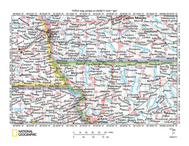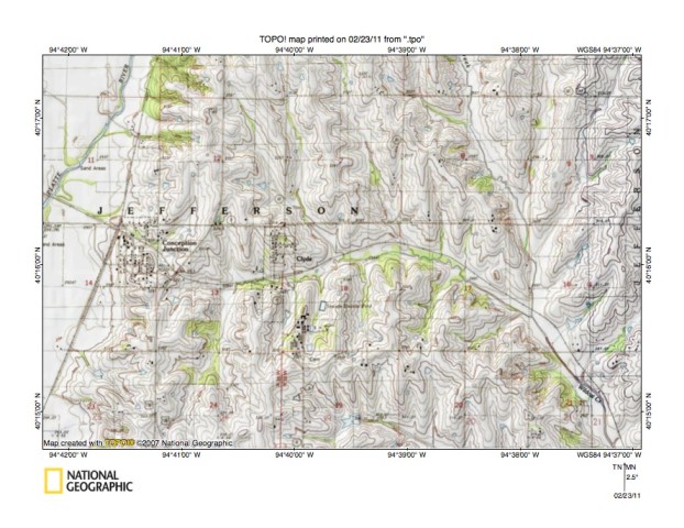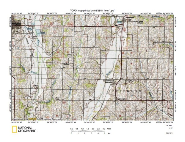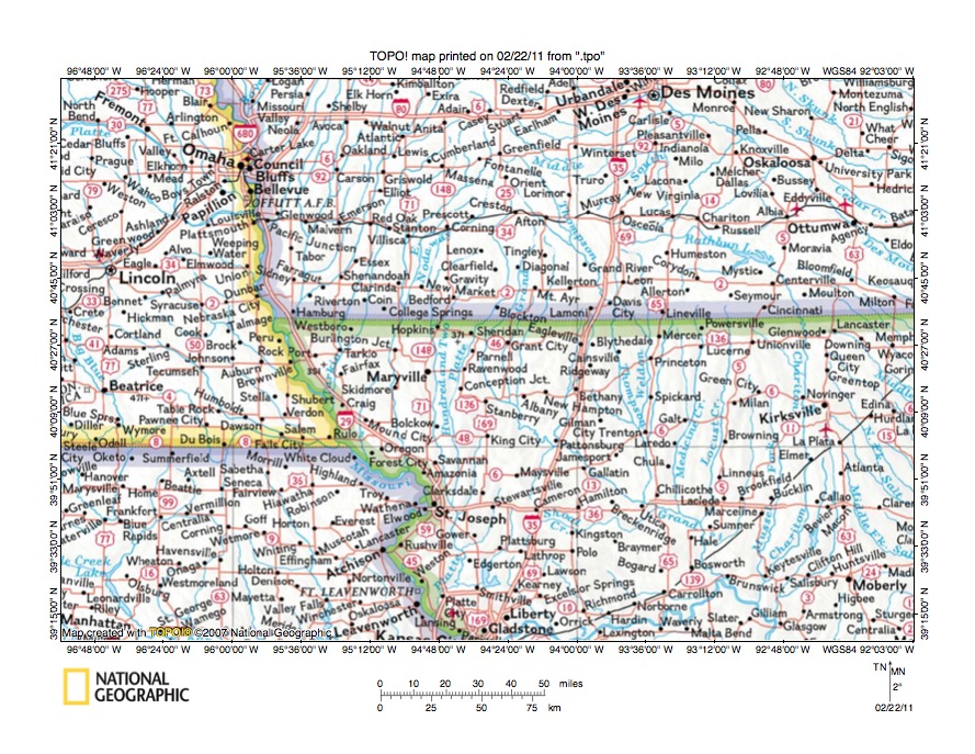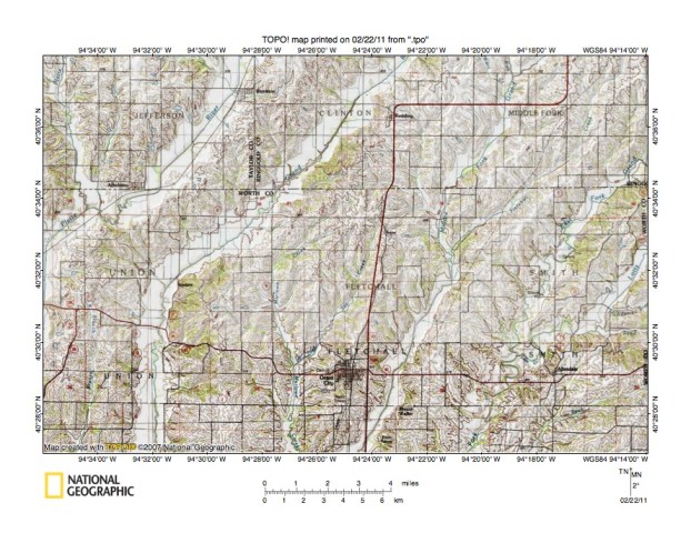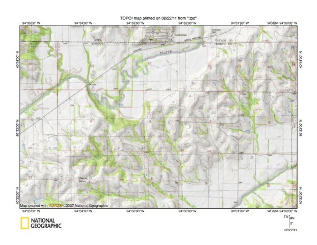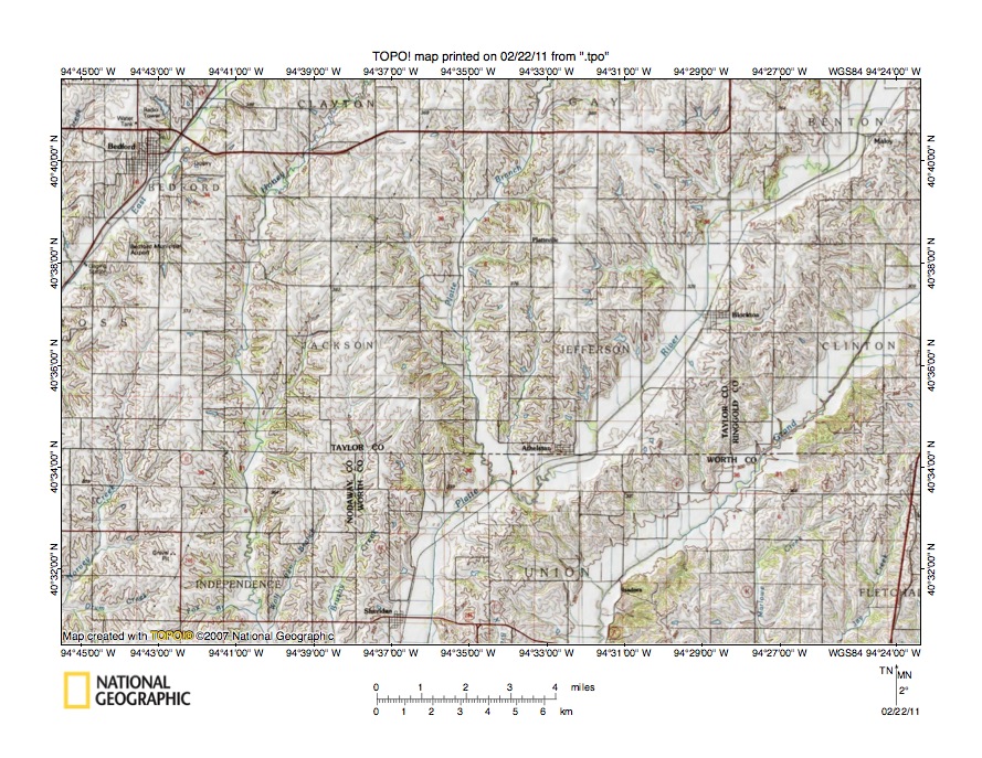 - Figure 5 illustrates the East Fork One Hundred and Two River-Grand River drainage divide area along the Iowa-Missouri border north and east of the figure 3 map area. Bedford, Iowa is the town in the figure 5 northwest corner. Athelstan, Iowa is the much smaller town located east of the figure 5 south center area and on the north side of the west-east oriented Iowa-Missouri state line. Sheridan, Missouri is the town located near the figure 5 south center edge and is located just east of the Nodaway-Worth County line. The East Fork One Hundred and Two River flows in a south-southwest direction in the figure 5 northwest corner area and joins the other forks to form the south-oriented One Hundred and Two River a short distance west of the figure 5 map area. Note how the East Fork One Hundred and Two River has northwest oriented tributaries from the east. The northwest oriented tributary valleys were eroded by reversals of flood flow on northwest ends of beheaded flood flow routes. Novey Creek is a south-southwest oriented stream located in the figure 5 southwest corner and is linked to a northwest oriented East Fork tributary by a shallow north-south oriented through valley. East of the East Fork One Hundred and Two River is south-southwest and south oriented Honey Creek which flows through the word CLAYTON near the figure 5 north edge to the word INDEPENDENCE near the south edge. Honey Creek tributaries from the west are southeast or east oriented and are often aligned with northwest-oriented East Fork One Hundred and Two River tributaries. Honey Creek also has northwest-oriented tributaries from the west, especially along the south-southwest oriented segment (and the south-southwest oriented tributary located near the word JACKSON). The southwest oriented river flowing from the figure 5 northeast corner to the south center edge is the Platte River. The Platte Branch is the south-oriented stream between Honey Creek and the Platte River which joins the Platte River just west of Athelstan. Platte Branch has southeast-oriented tributaries from the west, some of which are aligned with northwest- and west-oriented Honey Creek tributary valleys. The southwest and south-oriented river flowing immediately to the east of the Platte River is the Grand River. Note how these two very distinct Missouri River tributaries are flowing in adjacent and parallel valleys, in some places less than two miles apart, yet as seen in figures 1 and 2 south of the figure 5 map area the Platte River continues to flow in a south direction while the Grand River turns to flow in a southeast direction and to join the Missouri River considerably down stream from where the Platte River joins the Missouri River. Note also through valleys eroded across the narrow Platte River-Grand River drainage divide suggesting Platte River valley headward erosion beheaded south-oriented flood flow channels to what was then the newly eroded Grand River valley.