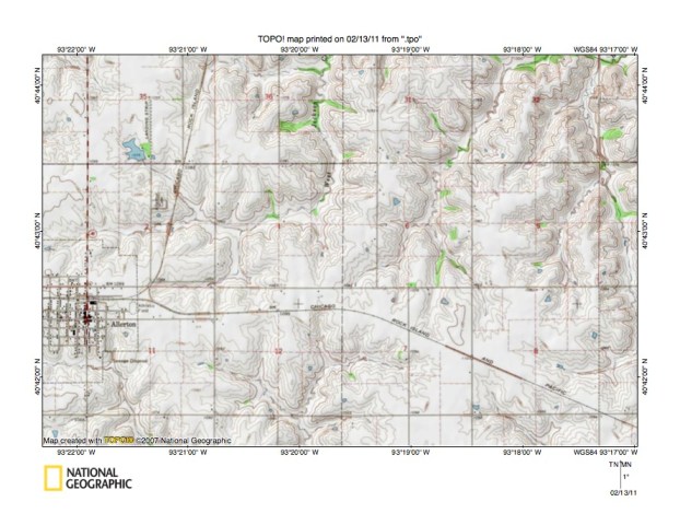 - Figure 10 provides a detailed topographic map of the West Jackson Creek-East Fork Medicine Creek drainage divide area east of Allerton, Iowa. Allerton is located near the west edge of the figure 10 southwest quadrant. West Jackson Creek flows in an east direction from the figure 10 west center edge across section 2 to section 1 where it turns to flow in a north direction to the figure 10 north center edge. Just north of figure 10 West Jackson Creek turns to flow in an east-northeast and east-southeast direction and can just barely be seen again near the figure 10 northeast corner. North-oriented streams flowing to section 32 in the figure 10 northeast corner are West Jackson Creek tributaries. South-oriented streams flowing to the figure 10 south edge are headwaters of south-oriented East Fork Medicine Creek, which flows to south-oriented Medicine Creek. The map contour interval is 10 feet and relief along the drainage divide is very low suggesting south-oriented flood flow moved across a flood formed erosion (deposition?) surface prior to headward erosion of the present day deep valleys. A close look at figure 10 does reveal evidence of what were once south-oriented flood flow channels to the actively eroding south-oriented East Fork Medicine Creek valley system. East of Allerton in the figure 12 northwest quadrant a shallow through valley links a north-oriented West Jackson Creek tributary valley with a south-oriented East Fork Medicine Creek headwaters valleys. The through valley appears to be narrow and appears to be defined by a single contour line on each side. However, further study of the figure 10 map reveals still higher elevations in the Allerton area and in the section 7 northeast quadrant suggesting instead of being narrow the through valley was almost three miles wide (the sections are one mile squares). While definitely not deep a three-mile wide valley provides evidence south oriented flood waters eroded broad flood flow channel into the surface on which the flood waters were flowing. Headward erosion of the east-oriented West Jackson Creek valley beheaded that south-oriented flood flow channel and the north-oriented West Jackson Creek valley segment seen in figure 10 was eroded by a reversal of flood flow on the north end of the beheaded flood flow channel. The east-oriented West Jackson Creek valley segment north of Allerton was eroded by captured flood flow, which had moved south-west of the actively eroding east-oriented West Jackson Creek valley head (just north of figure 10 center) and which was diverted to the newly reversed flood flow on the north-end of the beheaded south-oriented flood flow route.