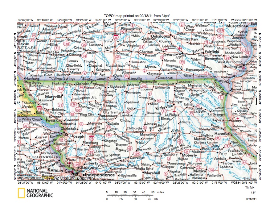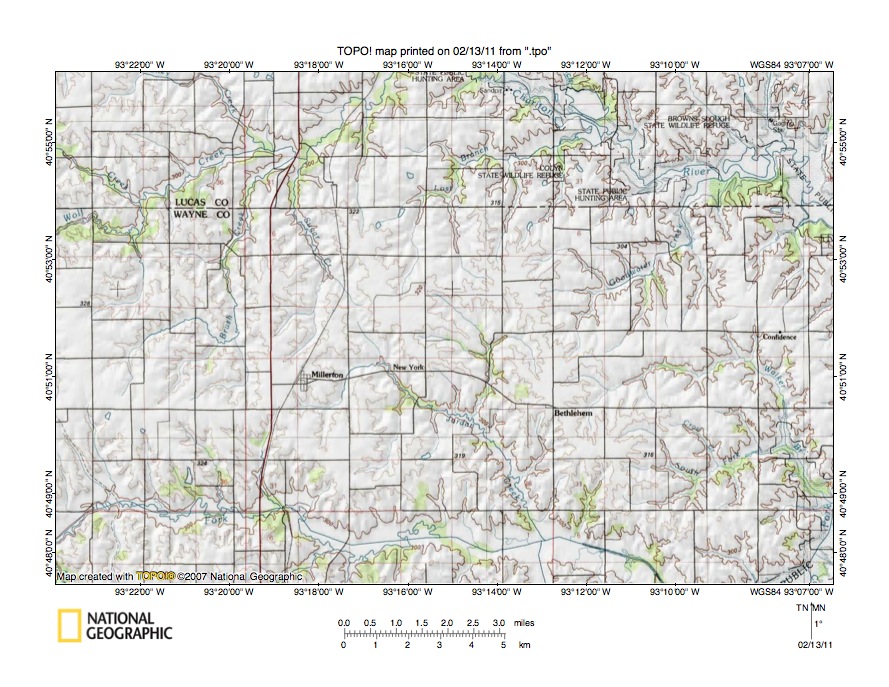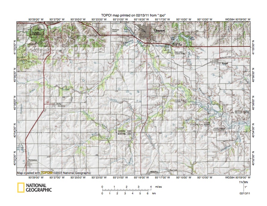 - Figure 1 provides a location map for the Chariton River-Grand River drainage divide area in Lucas, Decatur, and Wayne Counties, Iowa. The south-southwest and south-southeast oriented river near the figure 1 east edge is the Mississippi River, which eventually flows to the Gulf of Mexico. The state east of the Mississippi River is Illinois. West of the Mississippi River in the north of figure 1 is the state of Iowa and south of Iowa is the state of Missouri. The Missouri River flows in a south-southeast direction from the figure 1 west edge (slightly north of center) to Kansas City and then in an east-northeast direction to Brunswick, Missouri. From Brunswick the Missouri River flows in a southeast and south direction to the figure 1 south center edge. South of the figure 1 map area the Missouri River turns to flow in more of an east direction to join the south-oriented Mississippi River. The state in the figure 1 southwest corner and west of the Missouri River is Kansas and the Nebraska southeast corner can be seen west of the Missouri River and north of Kansas. The Des Moines River is a southeast oriented Mississippi River tributary flowing from the figure 1 north center area to join the Mississippi River along the Iowa-Missouri state line. The Chariton River originates south of Osceola, Iowa (in figure 1 north center area) and flows in an east, southeast, and south direction to join the Missouri River downstream from Brunswick, Missouri. Directly north of the Chariton River in south central Iowa are east and northeast oriented Des Moines River tributaries. The Grand River originates near Afton, Iowa (west of Osceola) and flows in a south, southeast, and south direction to join the Missouri River near Brunswick, Missouri. Several significant south-oriented tributaries flow to the southeast oriented Grand River segment in Missouri. The south-southeast and south oriented Thompson River originates near Greenfield, Iowa (north of Afton) and joins the southeast- and south-oriented Grand River near Utica, Missouri. The south-oriented Weldon River originates just south of the Chariton River headwaters (south of Osceola, Iowa) and joins the Thompson River near Trenton, Missouri. Further east are south-oriented Medicine Creek and Locust Creek, which originate near the Iowa-Missouri state line and which flow to the southeast-oriented Grand River segment upstream from Brunswick, Missouri. The Chariton River-Grand River drainage divide area of concern in this essay is located south of the east- and southeast-oriented Chariton River headwaters in south central Iowa and north of the Iowa-Missouri state line. Essays addressing landform origins in adjacent drainage divide areas include the Platte River-Thompson River drainage divide area in Adair, Union, Ringgold, and Decatur Counties, Iowa essay, the Des Moines River-Missouri River drainage divide area in Madison, Clarke, Lucas, and Monroe Counties, Iowa essay, and the Des Moines River-Grand River drainage divide area in Adair, Madison, Union, and Ringgold Counties, Iowa essay and can be found under Iowa on the side bar category list.