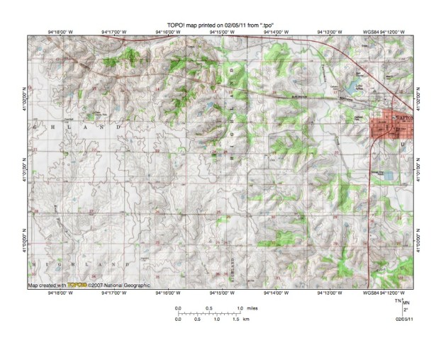 - Figure 9 uses a reduced size topographic map to illustrate the Twelvemile Creek-Grand River drainage divide area located south and east of the figure 8 map area and includes overlap areas with figure 8. Creston is the large town located near the figure 9 northwest corner. Twelvemile Creek flows in a southeast direction from the south end of Twelvemile Lake located near the figure 8 north center edge to join the south-southeast oriented Thompson River just north of the figure 9 southeast corner. Afton is the town located on the northeast side of the Twelvemile Creek valley at the highway intersection east of Creston. Talmage is the place-name where the west to east oriented highway crosses the south, southeast, and south oriented Thompson River (east of Afton) and Threemile Creek is the southeast-oriented stream joining the Thompson River near Talmage. Southwest and south-southwest oriented streams flowing to the figure 9 west edge are Platte River tributaries with the southwest, west, and south-southwest oriented East Platte River being the tributary flowing to the west edge north of the southwest corner. Shannon City is the small town located just north of the figure 9 south center edge. the south- and southwest-oriented river flowing through Shannon City is the Grand River. Note how both the south-oriented East Platte River headwaters and the south-oriented Grand River headwaters begin just south of the west to east oriented highway extending from Creston to Afton. An east-oriented Twelvemile Creek tributary parallels the highway and both the East Platte River headwaters valley and the Grand River headwaters valley are linked by a shallow through valley with north-oriented tributary valleys to that east-oriented Twelvemile Creek tributary valley. In other words headward erosion of the southeast-oriented Twelvemile Creek tributary valley beheaded a south-oriented flood flow channel which was diverging, with some of the flood water flowing to the actively eroding Grand River valley while some of the flood water was flowing to the actively eroding East Platte River valley. This evidence suggests a giant south-oriented anastomosing channel complex extending across what are today separate Missouri River tributary drainage basins was being captured by headward erosion of multiple deep south-oriented Missouri River tributary valleys. Figure 10 below provides a more detailed topographic map of the Twelvemile Creek-Grand River drainage divide area to better illustrate valley relationships.