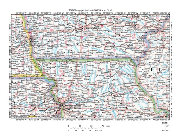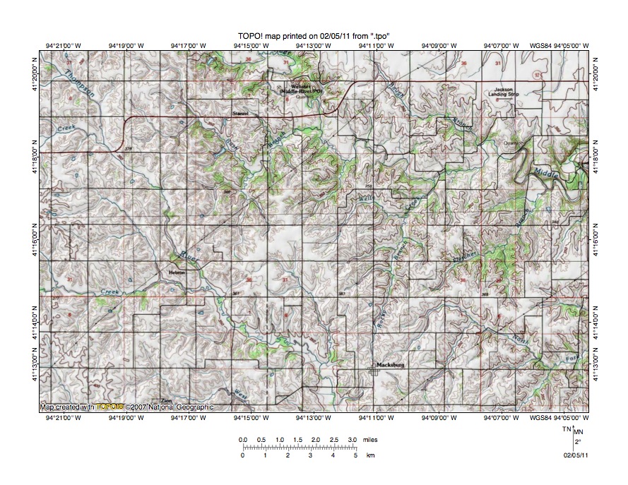 - Figure 1 provides a location map for the Des Moines River-Grand River drainage divide area in Adair, Madison, Union, and Ringgold Counties, Iowa. The Mississippi River flows in a south-southwest direction from the figure 1 northeast corner to the east center and then turns to flow in a south-southeast direction to the southeast corner. South of figure 1 the Mississippi River eventually flows to the Gulf of Mexico. The state east of the Mississippi River in figure 1 is Illinois. West of the Mississippi River in the figure 1 north half is Iowa and in the south half is Missouri. The Missouri River flows in a south-southeast direction from near the figure 1 northwest corner to Kansas City and then turns to flow in an east-northeast direction to Brunswick, Missouri. At Brunswick the Missouri River turns to flow in a southeast direction to the figure 1 south edge. South of the figure 1 map area the Missouri River turns again to flow in an east direction to join the south-oriented Mississippi River. The state west of the Missouri River in the figure 1 north half is Nebraska and the state in the southwest corner is Kansas. The Des Moines River flows in a south-southeast direction from the figure 1 north edge to Des Moines, Iowa and then flows in a southeast direction to join the Mississippi River at the Iowa-Missouri state border. Note southeast-oriented Des Moines River tributaries, some of which flow in a southeast and then northeast direction just south of Des Moines, Iowa. The Grand River originates near Afton, Iowa (south and west from Des Moines) and flows in a south and southeast direction to join the Missouri River near Brunswick, Missouri. A major Grand River tributary is the Thompson River, which originates near Greenfield (north of Afton and west and south from Des Moines) and which flows in a south-southeast and south direction to join the southeast-oriented Grand River near Utica, Missouri. West of the Grand River in Iowa and south of the Thompson River headwaters are headwaters of the south and south-southwest oriented Platte River and west of the Platte River drainage basin is the south-oriented Nodaway River drainage basin, with the East Nodaway River headwaters being located in the same region (near Greenfield) as the Thompson River headwaters. North of the south-oriented Nodaway, Platte, Grand, and Thompson River headwaters is the southeast-oriented Middle River, which turns to flow in an east-northeast direction to join the southeast-oriented Des Moines River. The Des Moines River-Grand River drainage divide area of concern in this essay includes the East Nodaway River, Platte River, Grand River, and Thompson River headwaters areas and drainage divides between their headwaters streams and also with the Middle River. Note how the drainage divide with the Middle River is not only the Des Moines River (or Middle River) River-Grand River drainage divide, but also the Mississippi River-Missouri River drainage divide.