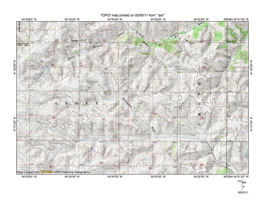 - Figure 10 provides a detailed topographic map of the Twelvemile Creek-Grand River drainage divide area west of Afton, Iowa and seen in less detail in figure 9 above. Afton is the town located near the figure 10 east edge (north half). Twelvemile Creek flows in an east, south-southeast and southeast direction from the figure 10 north center edge (just north of the vertical word HIGHLAND) to the figure 10 east edge (south half). The unnamed east-northeast oriented stream between the highway and railroad in the figure 10 northwest quadrant is a Twelvemile Creek tributary. The Grand River originates in section 23 (near figure 10 center) and flows in a south-southeast direction to the figure 10 south edge (near center). The East Platte River originates in section 22 and flows in a south direction to the figure 10 south edge in section 34. Note north-oriented tributaries the east-northeast-oriented Twelvemile Creek tributary on the same alignments as the Grand River and East Platte River headwaters. A case can be made for very shallow through valleys eroded into what appears to be an almost level drainage divide separating the Twelvemile Creek tributary valley from the south-oriented Grand River and East Platte River valleys, however the evidence is subtle. The shallow through valleys are easiest to identify in sections 24, 25, and 19 and represent through valleys between a north-oriented Twelvemile Creek tributary valley and south-oriented Grand River headwaters valleys and also a southeast and east-northeast oriented Twelvemile Creek tributary valley (seen in figure 10 southeast quadrant). More subtle through valleys can be identified in sections 22 and 23. Orientations of north-oriented tributary valleys, north of the drainage divide and of the south-oriented East Platte River, Grand River, and the southeast and east-northeast oriented Twelvemile Creek tributary headwaters valleys and the shallow through valleys, provide evidence of diverging flood flow channels which flowed on an erosion (and/or deposition?) surface at least as high as the present day drainage divide. Headward erosion of the deep Twelvemile Creek valley and its unnamed east-northeast tributary valley (near north edge) captured the diverging flood flow routes in sequence from east to west. Flood waters on north ends of the beheaded flood flow routes reversed flow direction to erode the north-oriented Twelvemile Creek tributary valleys and tributary valleys to the unnamed east-northeast oriented Twelvemile Creek tributary valley. The figure 10 evidence demonstrates that at one time flood waters flowed simultaneously to what were then actively eroding Thompson River, Grand River, and Platte River valleys, all of which had eroded headward from the newly eroded Missouri River valley.