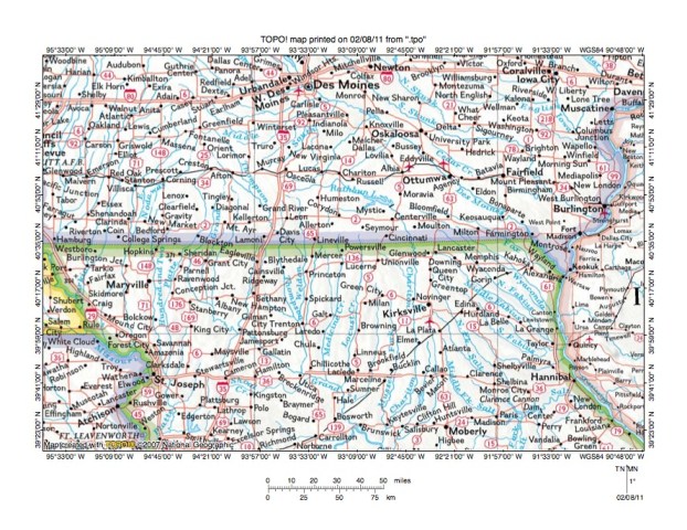 - Figure 1 illustrates a Des Moines River-Missouri River drainage divide area location map. The south-southwest and south-southeast oriented river flowing to the figure 1 southeast corner is the Mississippi River, which eventually flows to the Gulf of Mexico. The state west of the Mississippi River in the figure 1 north half is Iowa. South of Iowa is the state of Missouri. The south-southeast oriented river (with a southwest jog downstream from St. Joseph) in the figure 1 southwest quadrant is the Missouri River. South of the figure 1 southwest quadrant the Missouri River turns to flow in an east-northeast direction to Brunswick, Missouri (located just north of the figure 1 south center edge) and then turns to flow in a southeast and east direction to join the south-oriented Mississippi River. Note how Mississippi River tributaries from the west are predominately oriented in a southeast direction. The Des Moines River is a southeast oriented Mississippi River tributary flowing through Des Moines, Iowa to join the Mississippi River at the Iowa southeast corner. Note how west of Des Moines, Iowa there are several southeast oriented Des Moines River tributaries, with the southeast-oriented Middle River turning to flow in an east-northeast direction. South and east of Des Moines the Des Moines River has several northeast-oriented tributaries. South of the Des Moines River drainage basin in south central Iowa are headwaters of what become south-oriented Missouri River tributaries. Of particular interest to this essay are the east, east-southeast, and south oriented Chariton River (which flows to the Missouri River downstream from Brunswick, Missouri) and the south-southeast oriented Thompson River, which flows to the southeast- and south-oriented Grand River (which then flows to the Missouri River near Brunswick, Missouri). The Des Moines River-Missouri River drainage divide area in Clarke, Lucas, and Monroe Counties, Iowa is located east of the Thompson River and west of Rathbun Lake, which is the large reservoir located on the Chariton River in southern Iowa, and north of the Chariton River and is the drainage divide between north-oriented Des Moines River tributaries and south-oriented Missouri River tributaries.