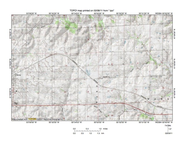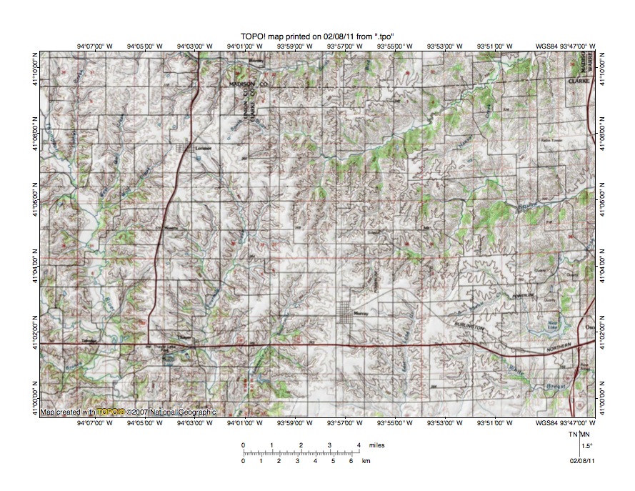 - Figure 3 uses a reduced size topographic map to illustrate the South River-Thompson River drainage divide in northwest Clarke County and northeast Union County. The Thompson River flows in a south-southeast direction near the figure 3 west edge. Lorimor is the town located in the figure 3 northwest quadrant. Fourmile Creek originates near Lorimor and flows in a south-southeast direction and south direction to the figure 3 south edge (west half). Murray is the town just east of the figure 3 south center area. Sevenmile Creek is the south-southwest oriented stream between Fourmile Creek and Murray in the figure 3 south half. The south-oriented stream east of Murray is East Long Creek. South of the figure 3 map area Long Creek, Fourmile Creek, and Sevenmile Creek join the south-oriented Thompson River, which then flows to the southeast and south-oriented Grand River, which in turn flows to the Missouri River. The South River originates a short distance north and east of Lorimor and flows in a northeast and southeast direction before turning to flow in a northeast direction to the figure 3 north edge (just west of the northeast corner). North and east of the figure 3 map area the South River flows to the southeast-oriented Des Moines River. The northeast-oriented stream with a north and south oriented jog in the figure 3 east center area and flowing to the figure 3 east edge (just north of center) is Squaw Creek (South Squaw Creek is a Squaw Creek tributary located north and west of the highway intersection near the figure 3 southeast corner). The north and southeast oriented stream in the figure 3 southeast corner is White Breast Creek, which is also a Des Moines River tributary. Note how South River and Squaw Creek both have north-oriented tributaries. A close look at the drainage divide between the north-oriented South River tributaries and south-oriented Fourmile Creek tributaries in the region between Lorimor and Murray reveals a shallow through valley, which is defined by one 10-meter contour line on each side. While a subtle landscape feature the through valley provides evidence of a south-oriented flood flow channel which was beheaded and reversed by headward erosion of the deep northeast-oriented South River valley (which was probably eroded by reversed flood flow moving to what was then the newly eroded southeast-oriented Des Moines River valley). Close study of the figure 3 map area reveals still more through valleys. For example near the substation (Substa) north and east of Murray a shallow through valley links a north-oriented South River tributary valley with a southeast-oriented Squaw Creek tributary valley. The through valley provides evidence of a south-oriented flood flow channel and also evidence the deep Squaw Creek valley was eroded prior to headward erosion of the deep northeast-oriented South River valley. Study of more detailed topographic maps reveals still additional shallow through valleys eroded across the drainage divides. Figure 4 below provides a detailed topographic map of the Squaw Creek-East Long Creek drainage divide.