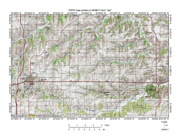- Figure 5 uses a reduced size topographic map to illustrate the Squaw Creek-White Breast Creek drainage divide area north and east of Osceola, Iowa. Osceola is the large town located in the figure 5 southwest quadrant. Lucas is the somewhat smaller town located near the figure 5 east edge and directly east from Osceola. White Breast Creek flows in an east-southeast and northeast direction from near Osceola to the figure 5 east edge near Lucas. East of the figure 5 map area White Breast Creek eventually flows to the Des Moines River. Squaw Creek is the northeast and north oriented stream in the figure 5 northwest corner. South Squaw Creek is the north-northeast oriented Squaw Creek tributary near the figure 5 west edge. The northeast oriented stream with a southeast jog originating on the north edge of Osceola and flowing to the figure 5 north edge (just east of center) is North Otter Creek. Middle Otter Creek is a north-northeast oriented Otter Creek originating a short distance east of Osceola (Otter Creek is formed at the confluence of North and Middle Otter Creeks). Victory Creek is the north-oriented tributary joining Otter Creek at its elbow of capture in the figure 5 north center area (where Otter Creek turns from flowing in a southeast direction to flowing in a northeast direction). South Otter Creek originates a short distance east of the Middle Otter Creek headwaters and flows in an east-northeast direction before turning to flow in a north-northwest direction to the figure 5 north edge. North of the figure 5 map area South Otter Creek joins with Otter Creek and both Squaw Creek and Otter Creek flow in north directions to join the northeast-oriented South River, which flows to the southeast-oriented Des Moines River. The north-oriented Squaw Creek and Otter Creek valleys north of the figure 5 map area were eroded by reversals of flood flow on north ends of south-oriented flood flow routes beheaded by South River valley headward erosion. Flood flow routes were beheaded in sequence from east to west with the south-oriented flood flow on the Otter Creek alignment being beheaded and reversed first. The east-northeast oriented South Otter Creek valley segment eroded headward across the figure 5 map area to capture flood flow moving south from west of the actively eroding South River valley head. Next headward erosion of the northeast-oriented Otter Creek-Middle Otter Creek valley beheaded the south-oriented flood flow routes to the newly eroded South Otter Creek valley and diverted the flood flow more directly to the north-oriented Otter Creek valley. Headward erosion of the South River valley subsequently beheaded and reversed flood flow routes so as to erode north-oriented Squaw Creek valley segments while east- and northeast-oriented valley segments and tributary valleys eroded headward to capture south-oriented flood flow routes located west of the actively eroding South River valley head.