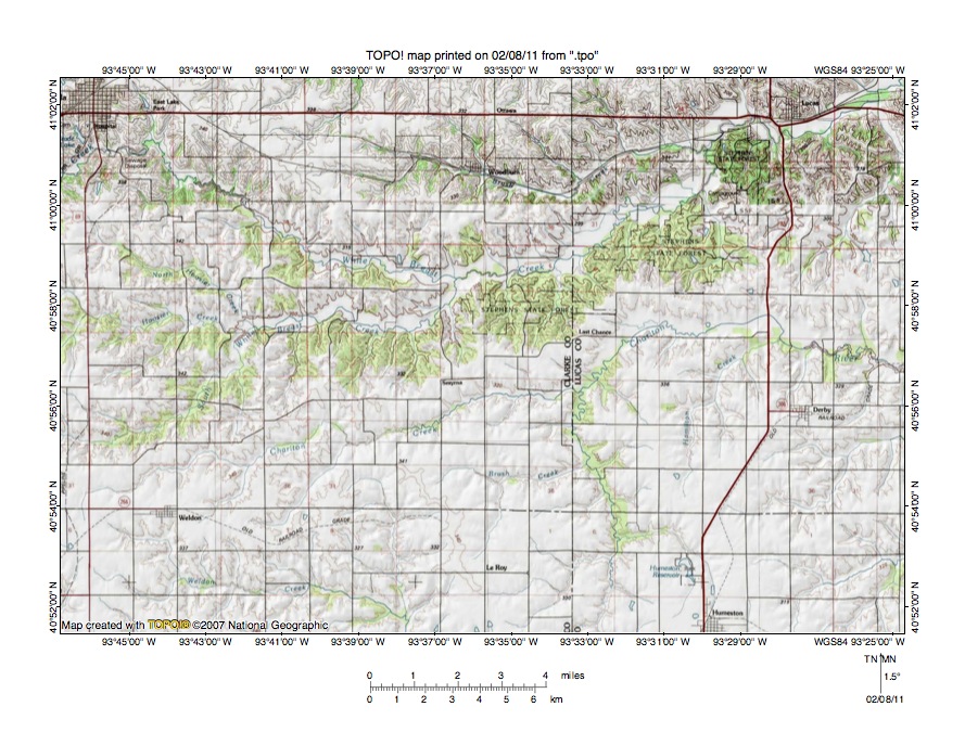 - Figure 2 provides a somewhat more detailed location map for the Des Moines River-Missouri River drainage divide area in Clarke, Lucas, and Monroe Counties, Iowa. County names and boundaries are shown. The Des Moines River flows in a southeast direction from Des Moines to the figure 2 east edge (east of Monroe County). Des Moines River tributaries of importance in this essay include Soap Creek, Cedar Creek, White Breast Creek, South River, and Middle River. Soap Creek originates in southeast Monroe County and flows in a southeast and east-northeast direction to join the Des Moines River east of the figure 2 map area. Cedar Creek originates near Russell in east central Lucas County and flows in an east and east-northeast direction almost to Albia in Monroe County before turning to flow in a northwest direction into the Marion County southwest corner. Once in Marion County Cedar Creek turns to flow in a northeast direction to join the Des Moines River. Northeast-oriented North Cedar Creek is a major Cedar Creek tributary. White Breast Creek originates near Osceola in Clarke County and flows in a generally east direction to Lucas in Lucas County before turning to flow in a north-northeast direction to join northwest-oriented Little White Breast Creek and then flowing in a northwest direction to Laconia in southeast Warren County. At Laconia White Breast Creek turns to flow in a northeast direction to the Des Moines River. The South River originates in the Clarke County northwest corner and flows in a northeast direction across the Madison County southeast corner and Warren County to join the Des Moines near the Warren County northeast corner. Squaw Creek and Otter Creek are northeast and north oriented South River tributaries also originating in northern Clarke County. The Middle River flows in a southeast direction to Webster (located on Madison County west border center) and then gradually changes to flow in a northeast direction through Bevington (located near center of Madison County east border) and then to join the Des Moines River near the Warren County northeast corner. The Thompson River flows in a south-southeast direction to the Union County southeast corner and then to figure 2 south edge. South of figure 2 the Thompson River flows to the southeast and south oriented Grand River, which flows to the Missouri River. Thompson River tributaries of significance in this essay include Fourmile Creek in eastern Union County and West and East Long Creek in southwest Clarke County. Chariton Creek originates near Weldon (located near center of Clarke County south border) and flows in an east-northeast and northeast direction to Chariton. Near Chariton the stream turns to flow in a northeast and then southeast direction and is renamed the Chariton River as it flows to the Lucas County southeast corner and then to the figure 2 south edge. South of the figure 2 map area the Chariton River turns to flow in a south direction to join the Missouri River (see figure 1). Few south-oriented Chariton River tributaries from the north are shown. Southeast-oriented streams located north and east of Chariton River in the figure 2 southeast corner flow to a northeast-oriented Des Moines River tributary east of the figure 2 map area. South and east of that unseen Des Moines River tributary are headwaters of several southeast-oriented Mississippi River tributaries.