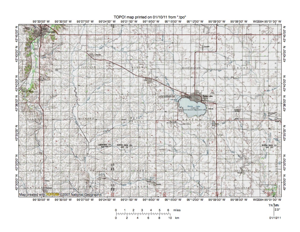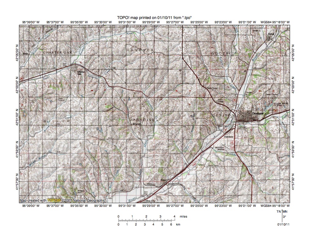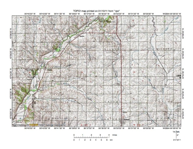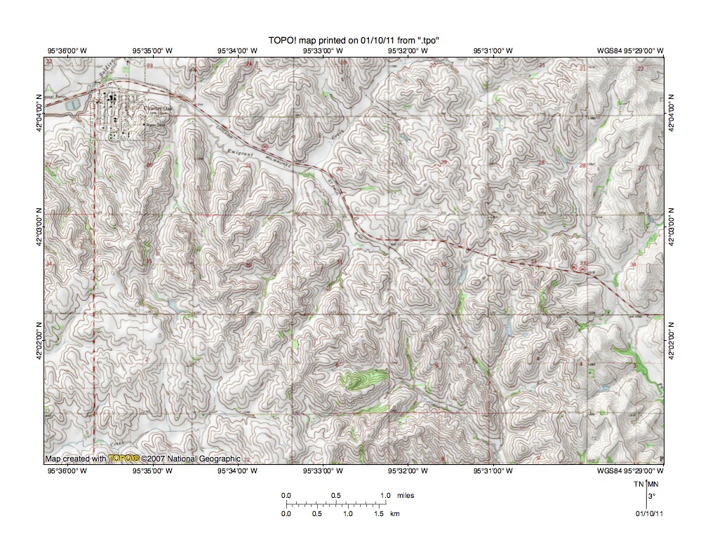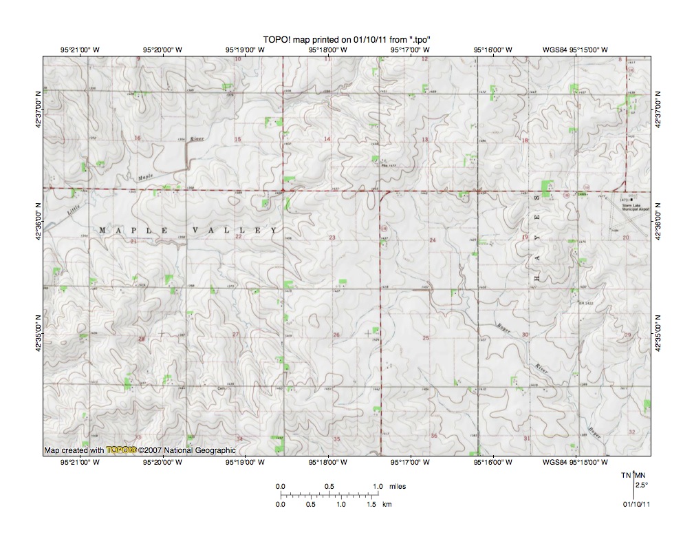 Figure 5: Little Sioux River-Silver Creek-Maple River drainage divide area. United States Geological Survey map digitally presented using National Geographic Society TOPO software.