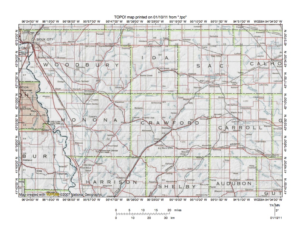 Figure 1: Little Sioux River-Boyer River drainage divide area location map (select and click on maps to enlarge). National Geographic Society map digitally presented using National Geographic Society TOPO software.
