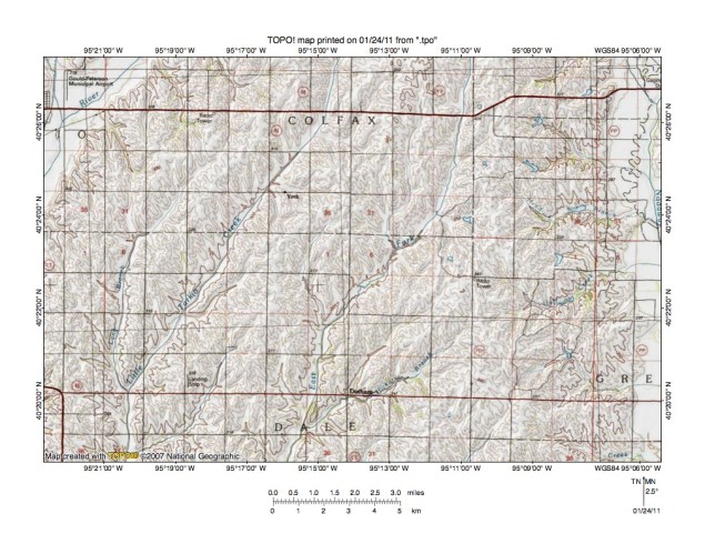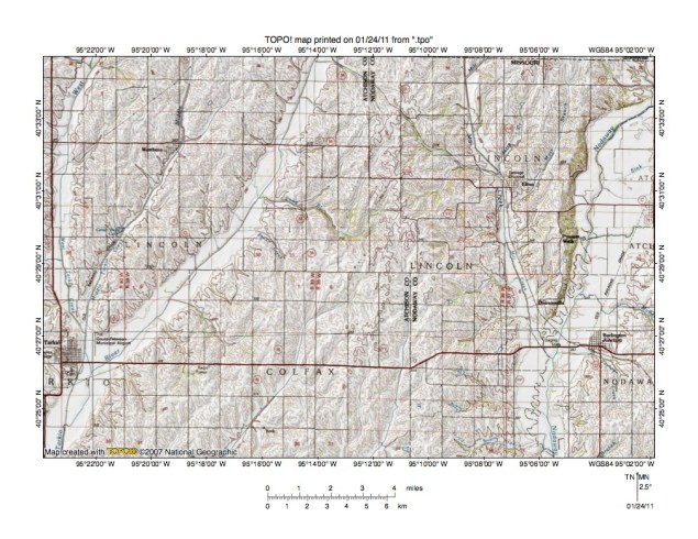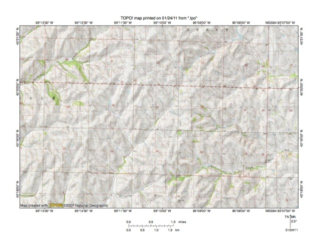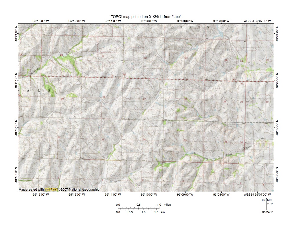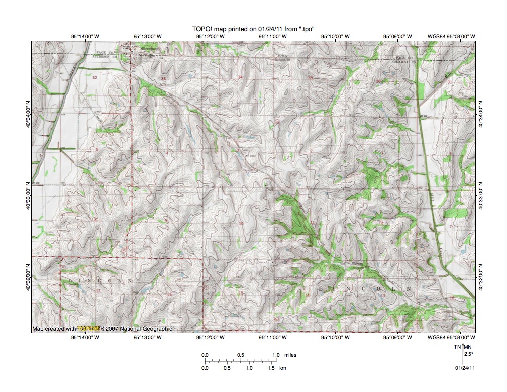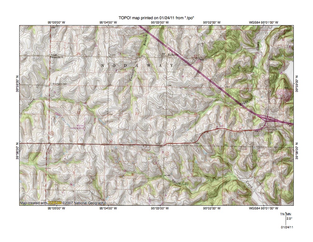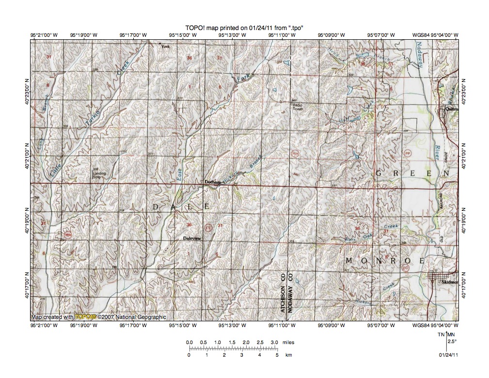 Figure 5: Tarkio River-Nodaway River drainage divide area southeast of Tarkio, Missouri. United States Geological Survey map digitally presented using National Geographic Society TOPO software.
