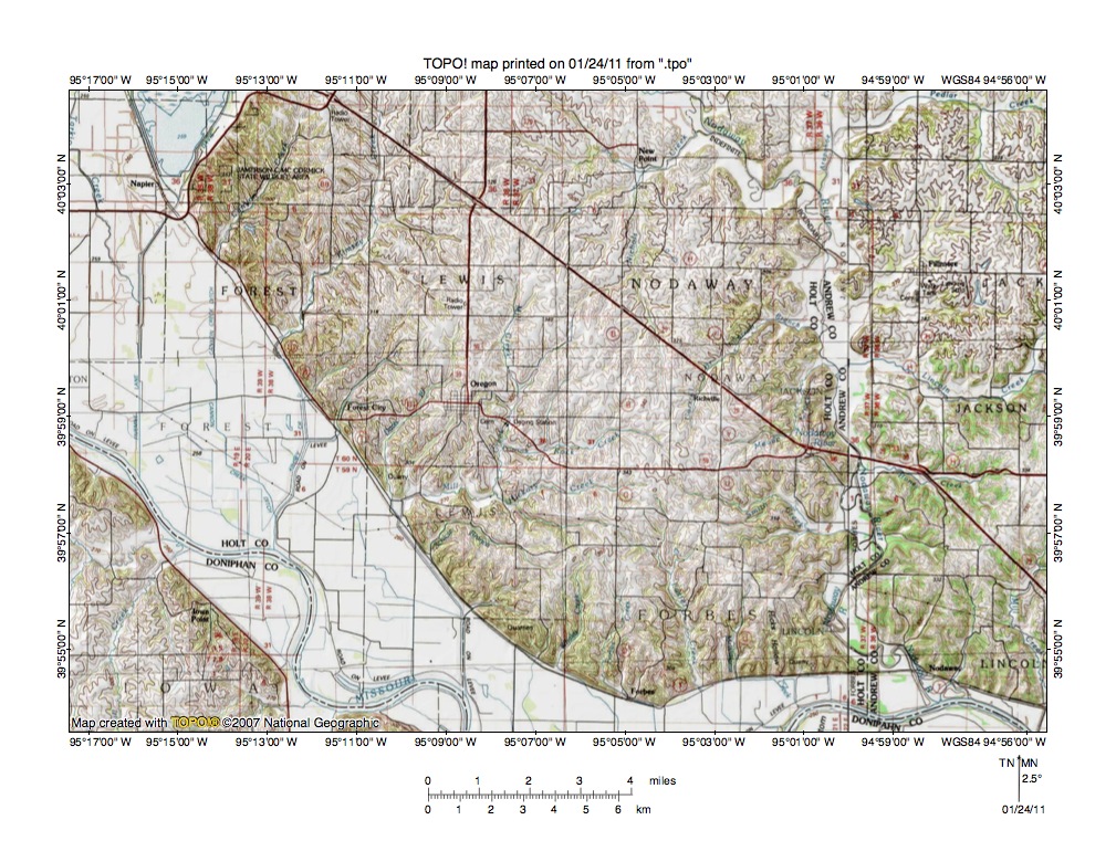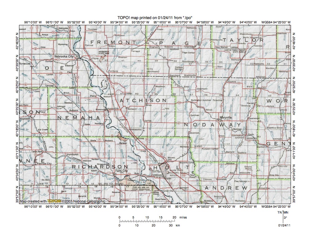 Figure 1: Tarkio River-Nodaway River drainage divide area location map (select and click on maps to enlarge). National Geographic Society map digitally presented using National Geographic Society TOPO software.