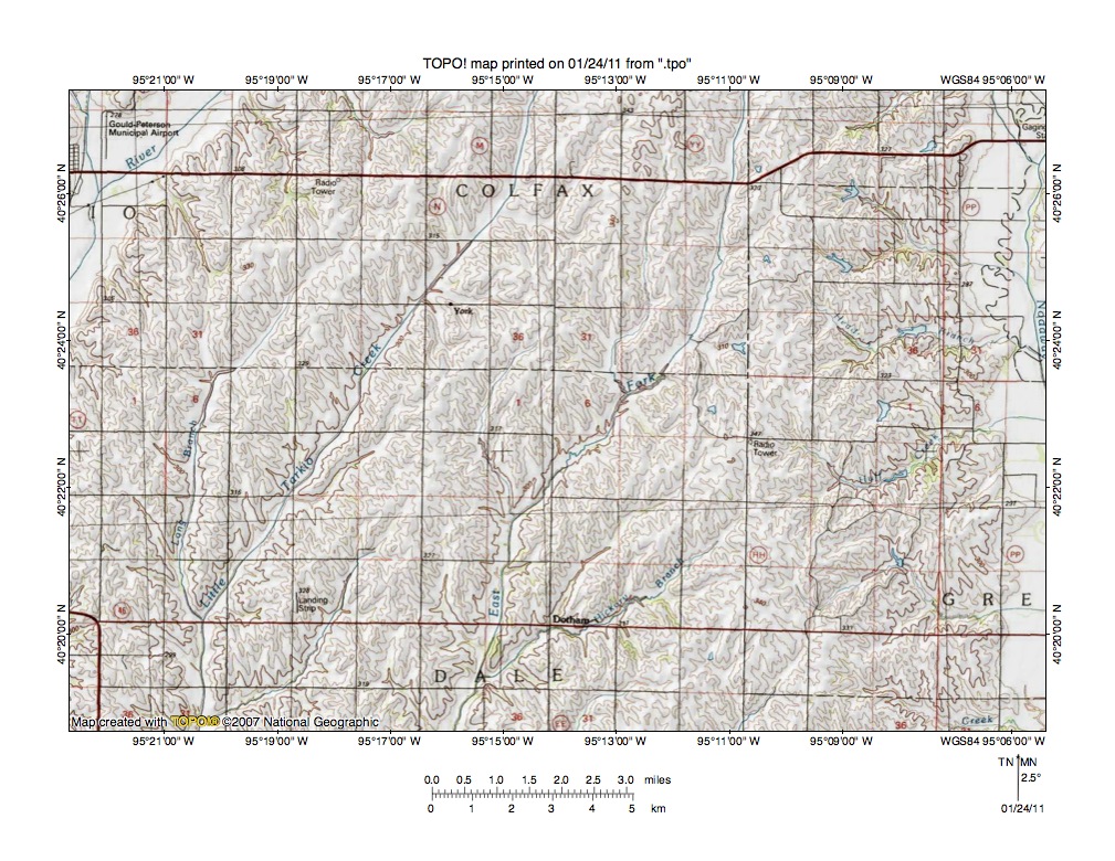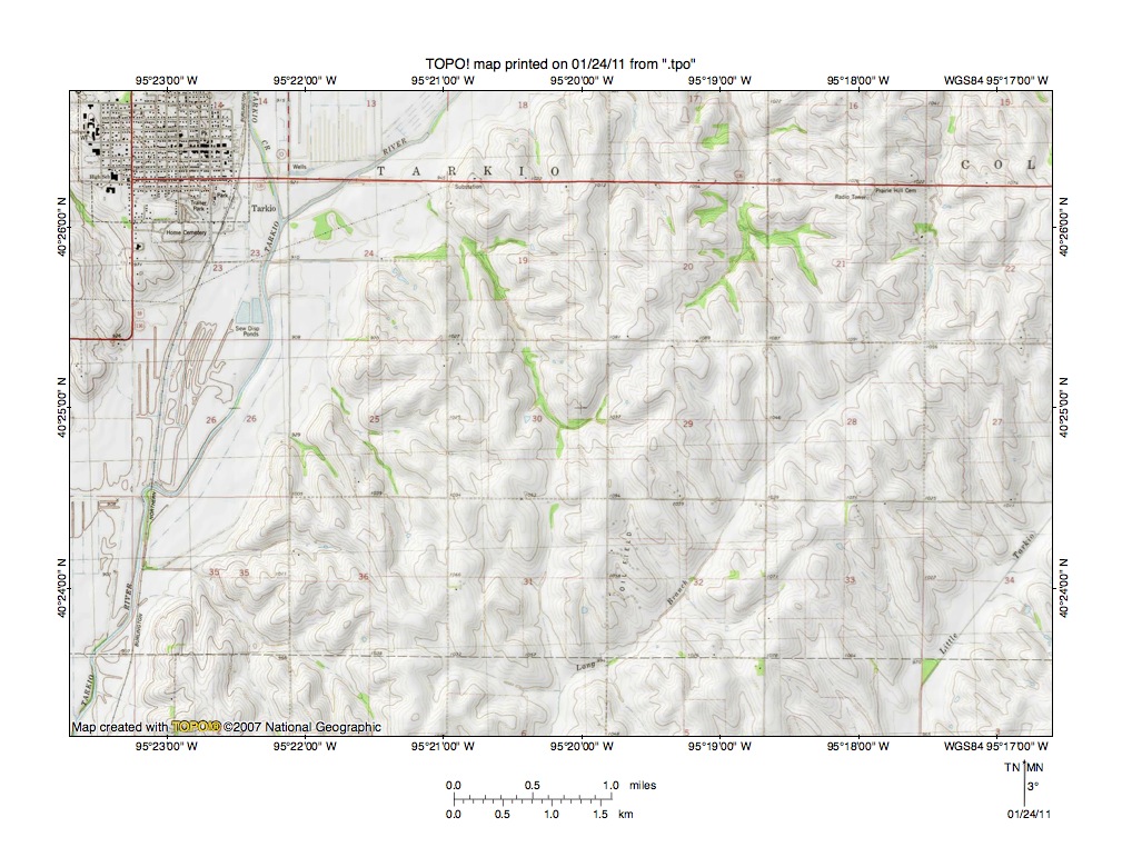 Figure 3: Tarkio River-Nodaway River drainage divide area northeast of Tarkio, Missouri. United States Geological Survey map digitally presented using National Geographic Society TOPO software.