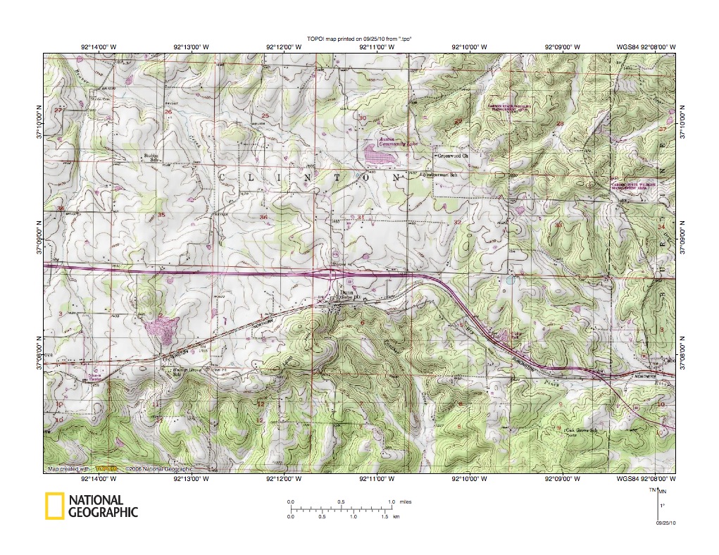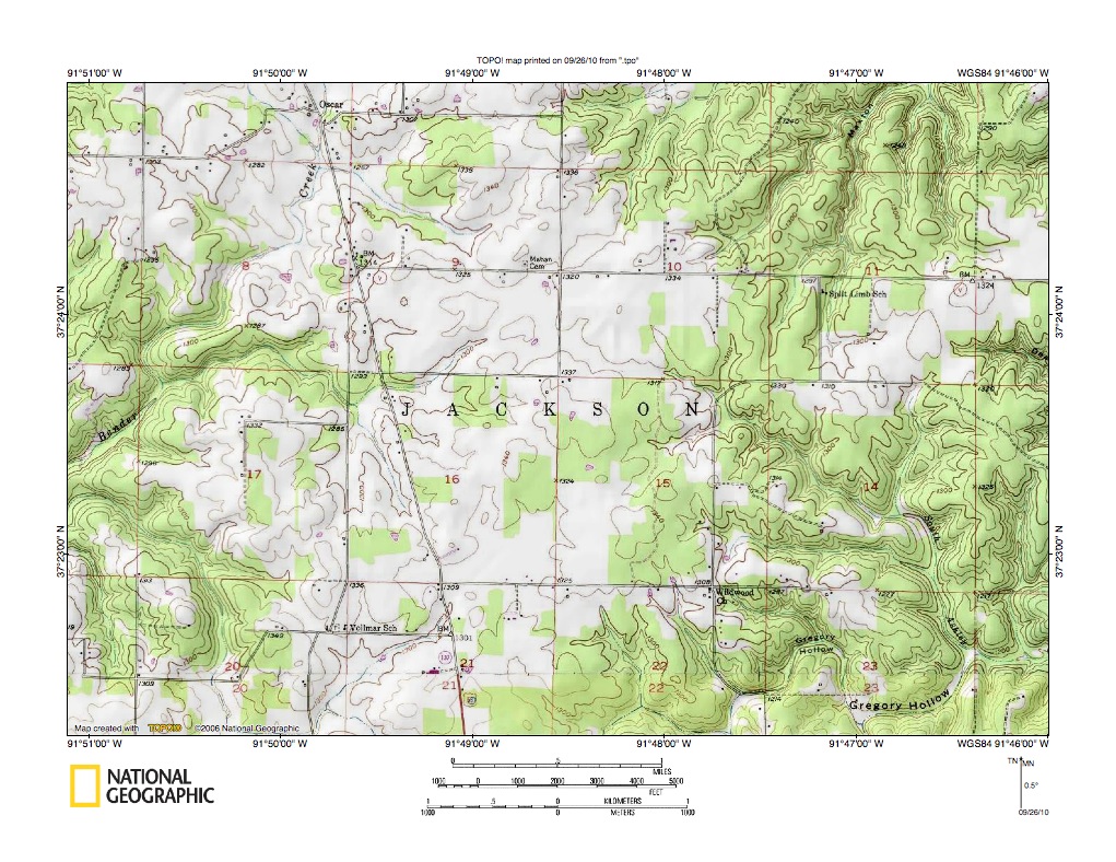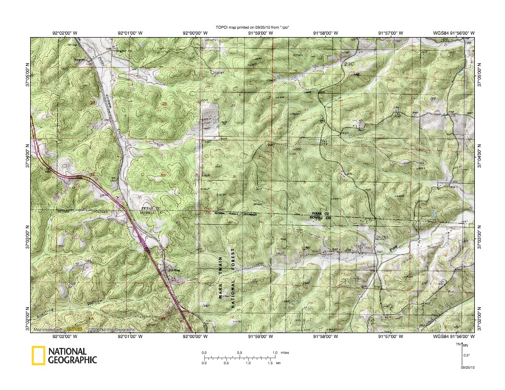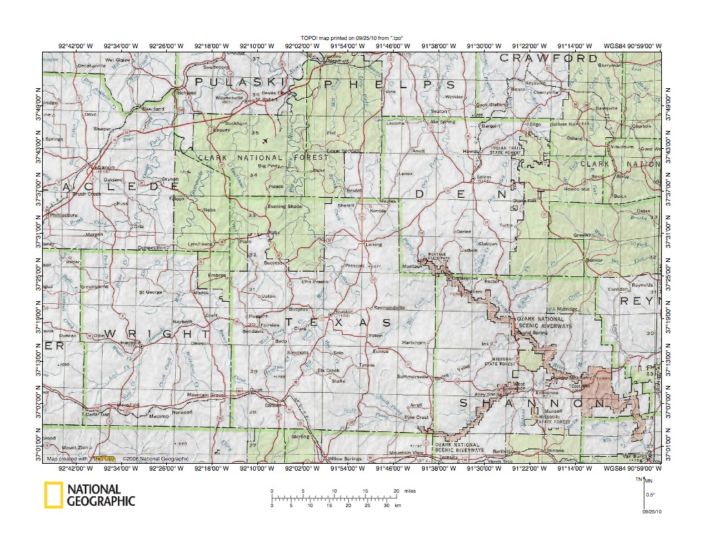 Figure 7: Map of northeast Texas County, Missouri. United States Geological Survey map digitally presented using National Geographic Society TOPO software.