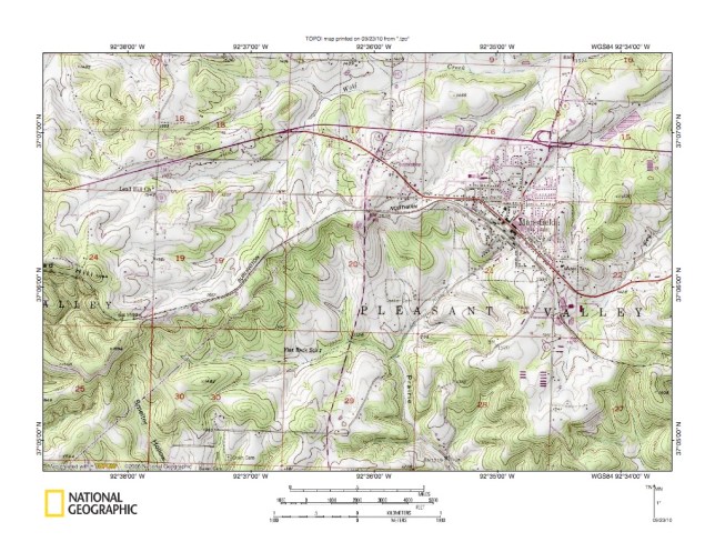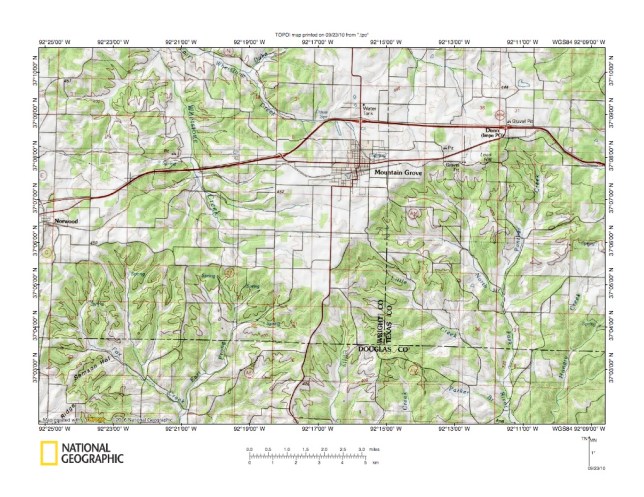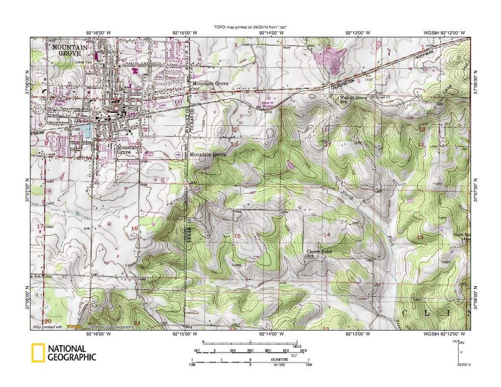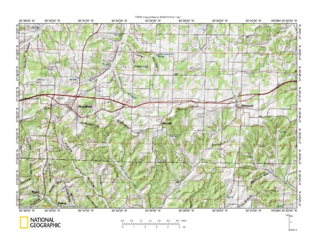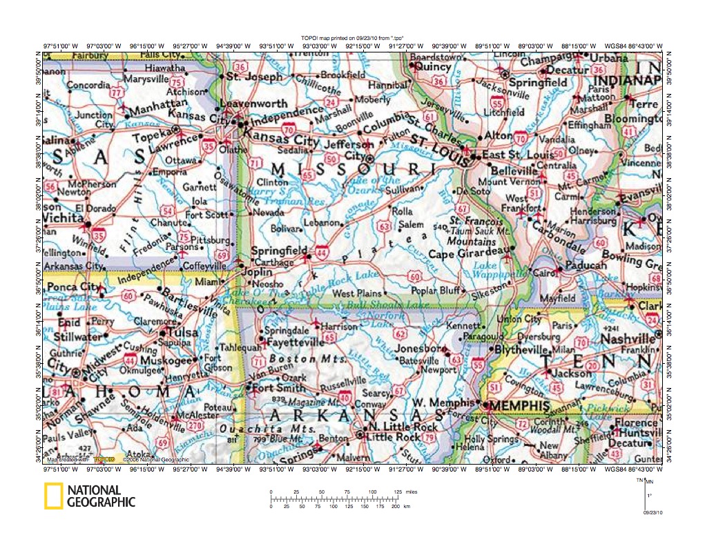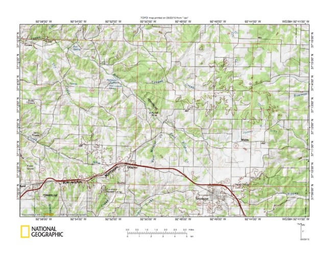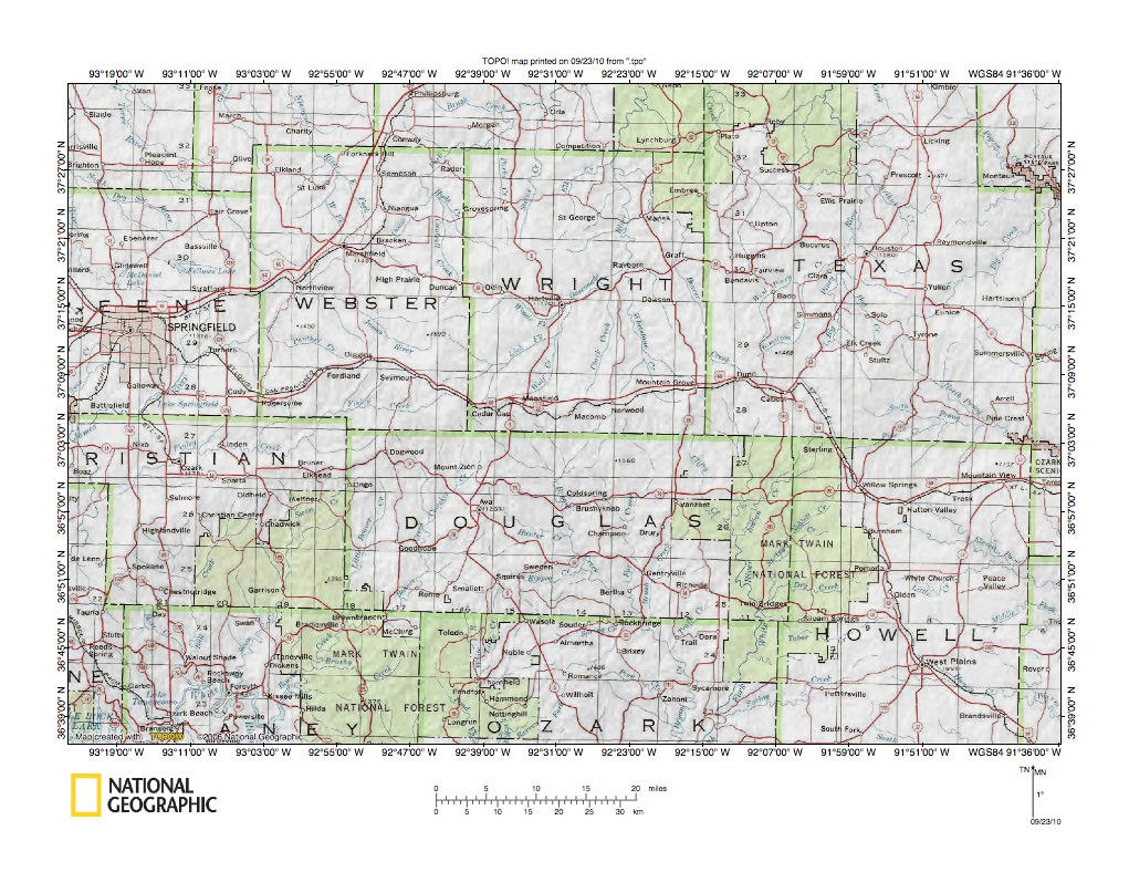 Figure 1: Gasconade River-White River drainage divide area location map (select and click on maps to enlarge). National Geographic Society map digitally presented using National Geographic Society TOPO software.