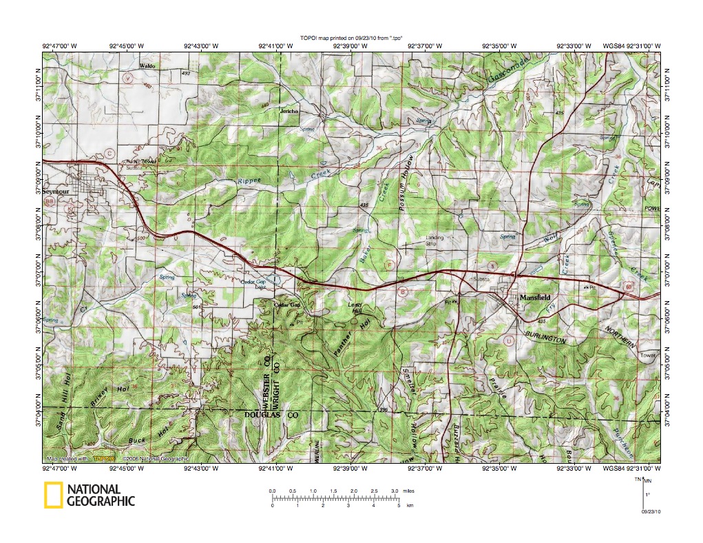 Figure 5: James River-Gasconade River drainage divide area. United States Geological Survey map digitally presented using National Geographic Society TOPO software.