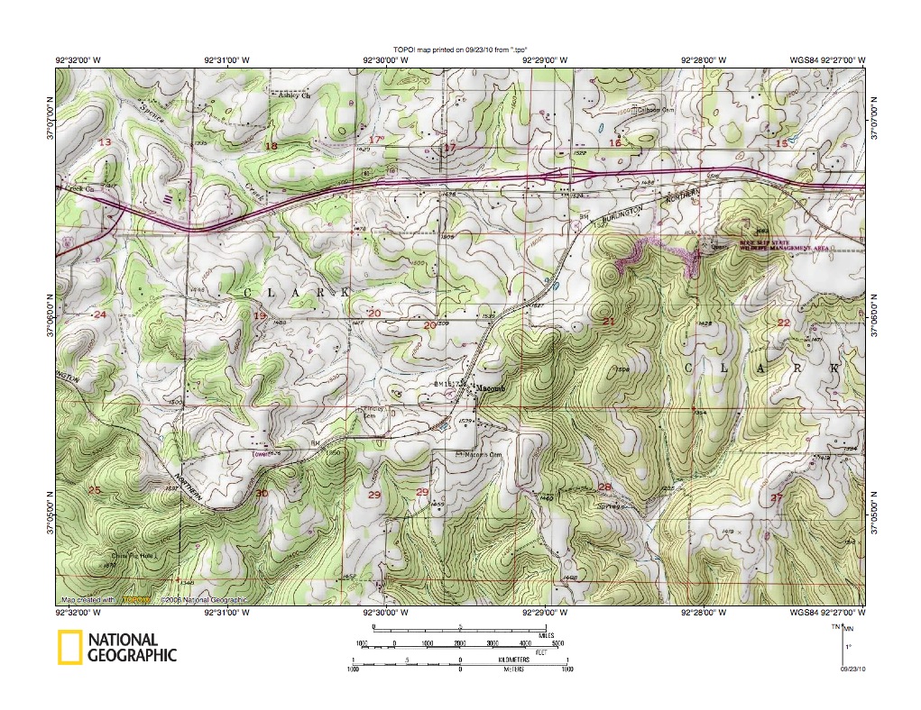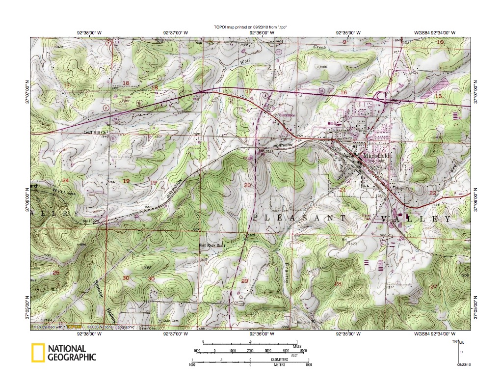 Figure 3: Gasconade River-Bryant Creek drainage divide area. United States Geological Survey map digitally presented using National Geographic Society TOPO software.