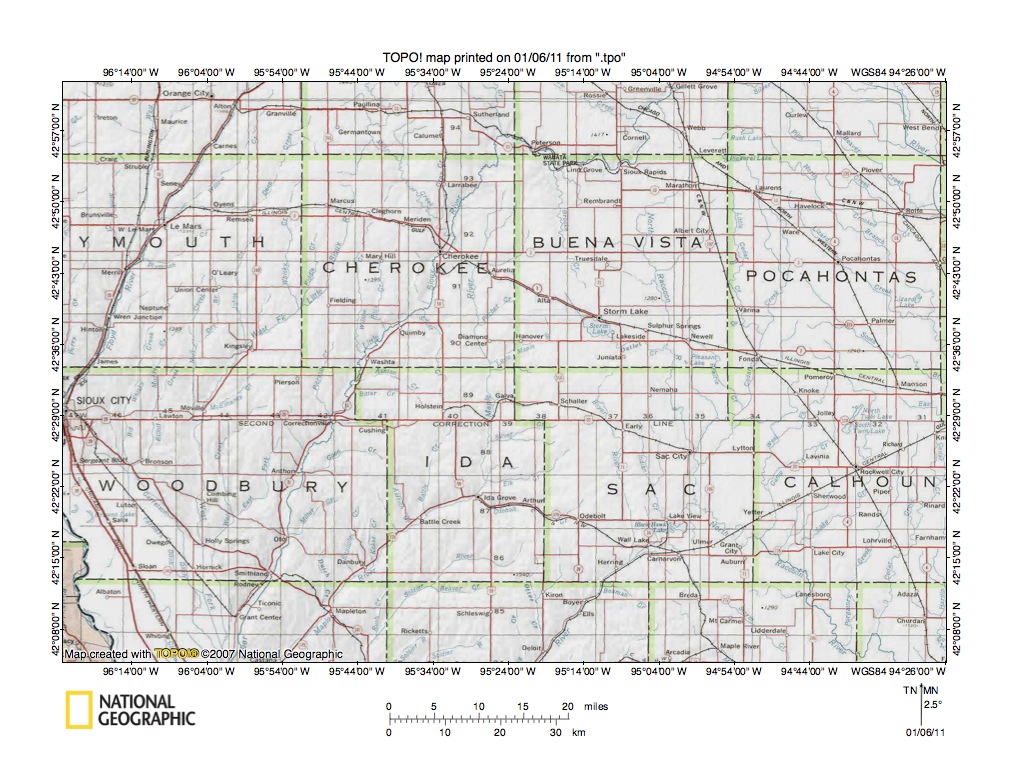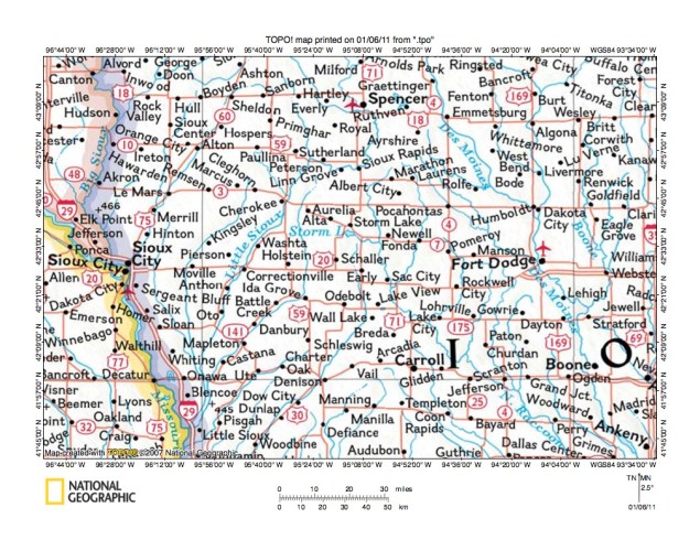 Figure 1: Location map for Little Sioux River-North Raccoon River drainage divide area (select and click on maps to enlarge). National Geographic Society map digitally presented using National Geographic Society TOPO software.
